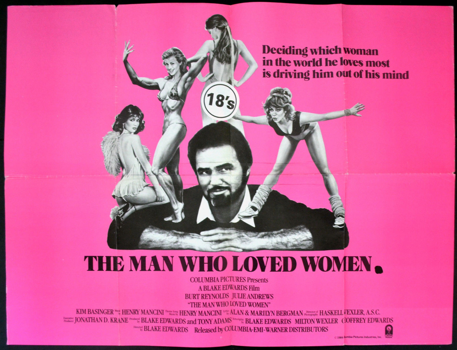 Original British 30 inch by 40 inch Quad poster for the 1983 Blake Edwards Comedy THE MAN WHO LOVED WOMEN starring Burt Reynolds, Julie Andrews, Kim Basinger and Marilu Henner.