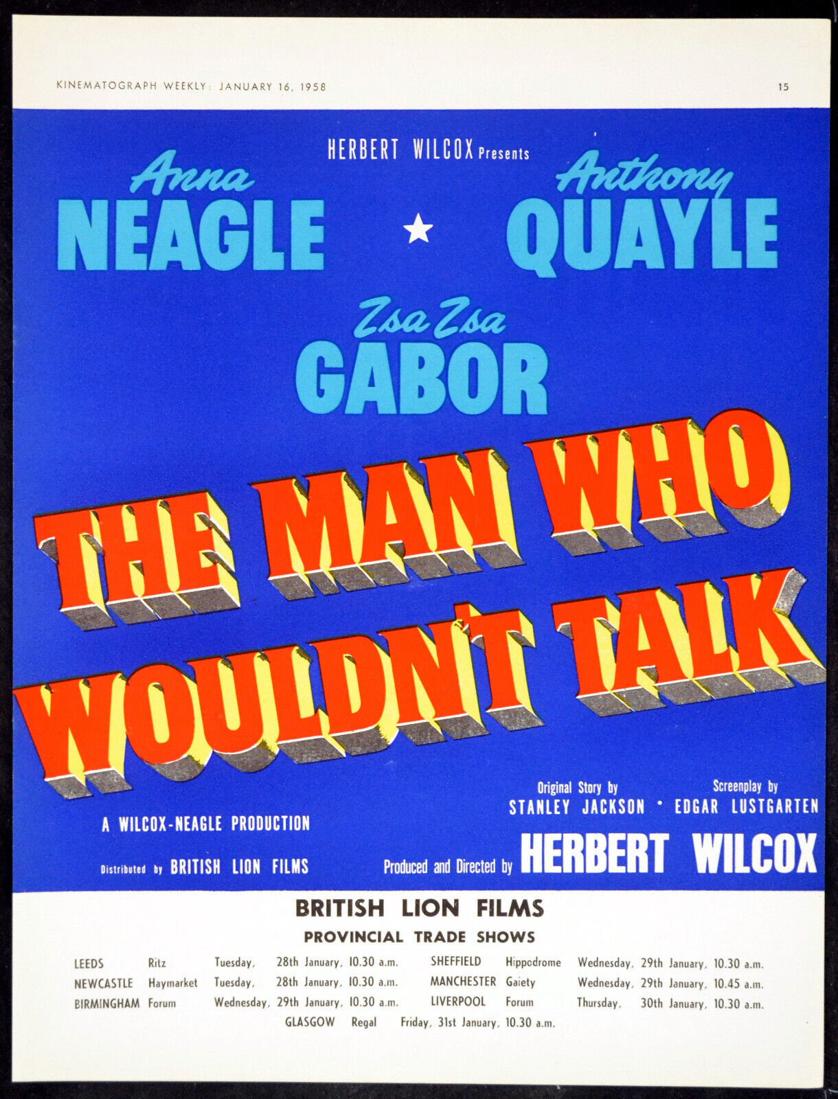 Original British 11 inch x 8 1/2 inch Trade Advertisement from Kinematograph Weekly for the 1958 Herbert Wilcox Courtroom Drama THE MAN WHO WOULDN’T TALK, screenplay by Edgar Lustgarten and starring Anthony Quayle, Anna Neagle, Zsa Zsa Gabor, Dora Bryan, Katherine Kath, Patrick Allen, Lloyd Lamble, Hugh McDermott, Leonard Sachs, John Le Mesurier, Cyril Chamberlain and Edward Lexy.