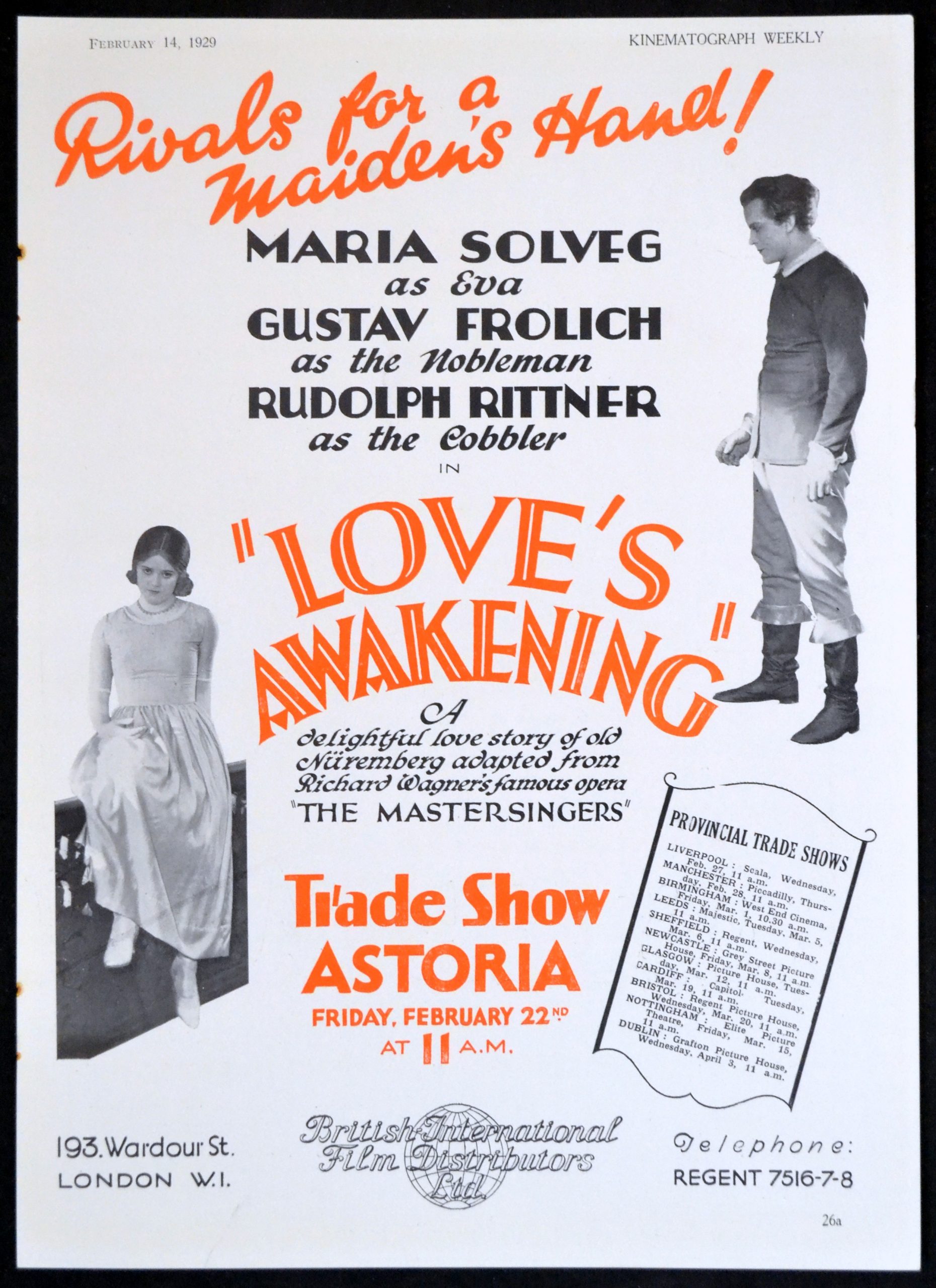 On the reverse is the 1927 Ludwig Berger German Historical Comedy LOVE’S AWAKENING (DER MEISTER VON NURNBEG), based on the 1868 opera “Die Meistersinger von Nürnberg” by Richard Wagner and starring Rudolf Rittner, Max Gülstorff, Maria Solveg, Gustav Fröhlich, Julius Falkenstein and Veit Harlan .