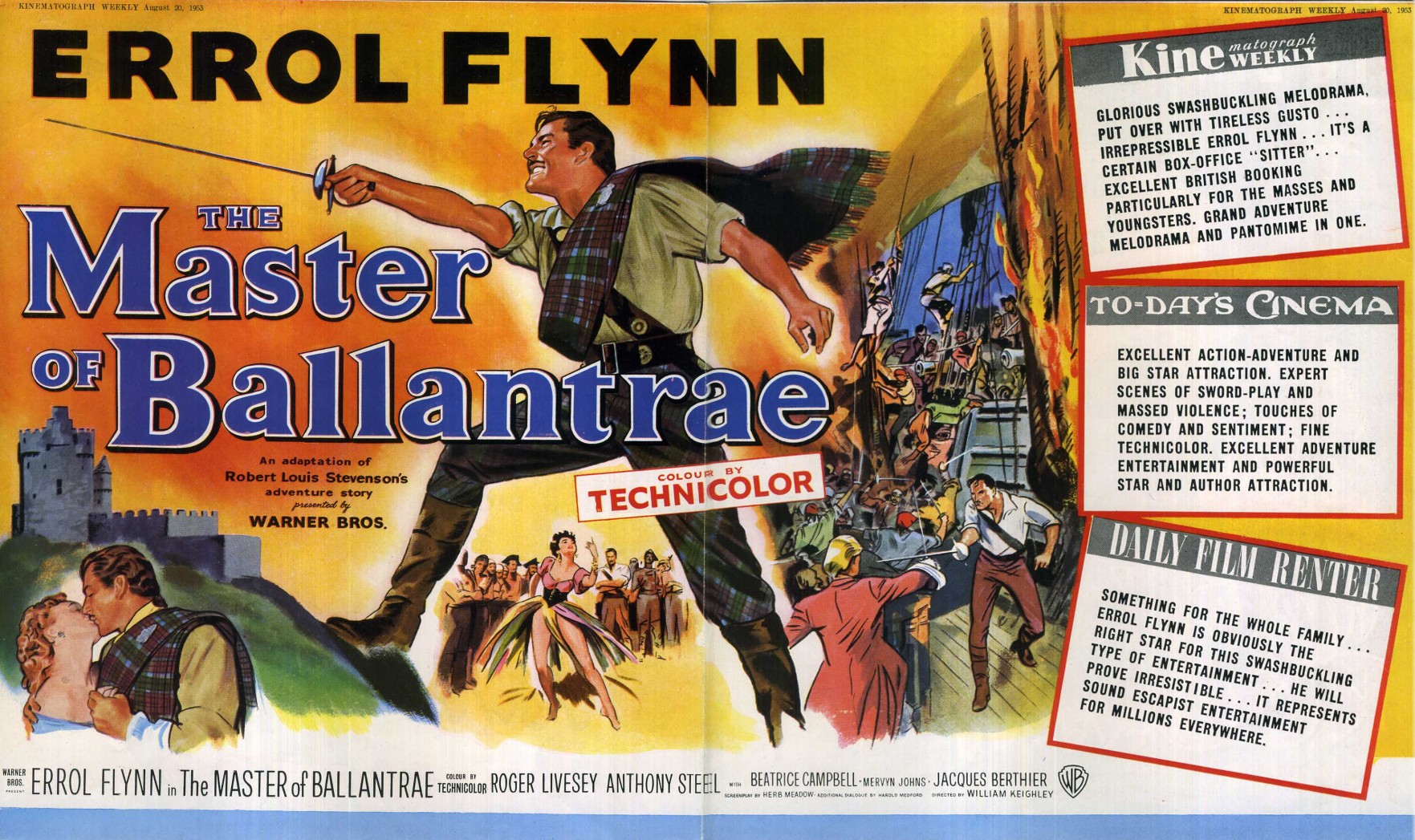 Original British 10 inch x 17 inch Trade Advertisement for the 1953 William Keighley Adventure THE MASTER OF BALLANTRAE, based on the novel by Robert Louis Stevenson and starring Errol Flynn, Roger Livesey, Anthony Steel, Beatrice Campbell, Mervyn Johns, Yvonne Furneaux, Felix Aylmer, Charles Goldner, Ralph Truman, Francis De Wolff and Jacques Berthier