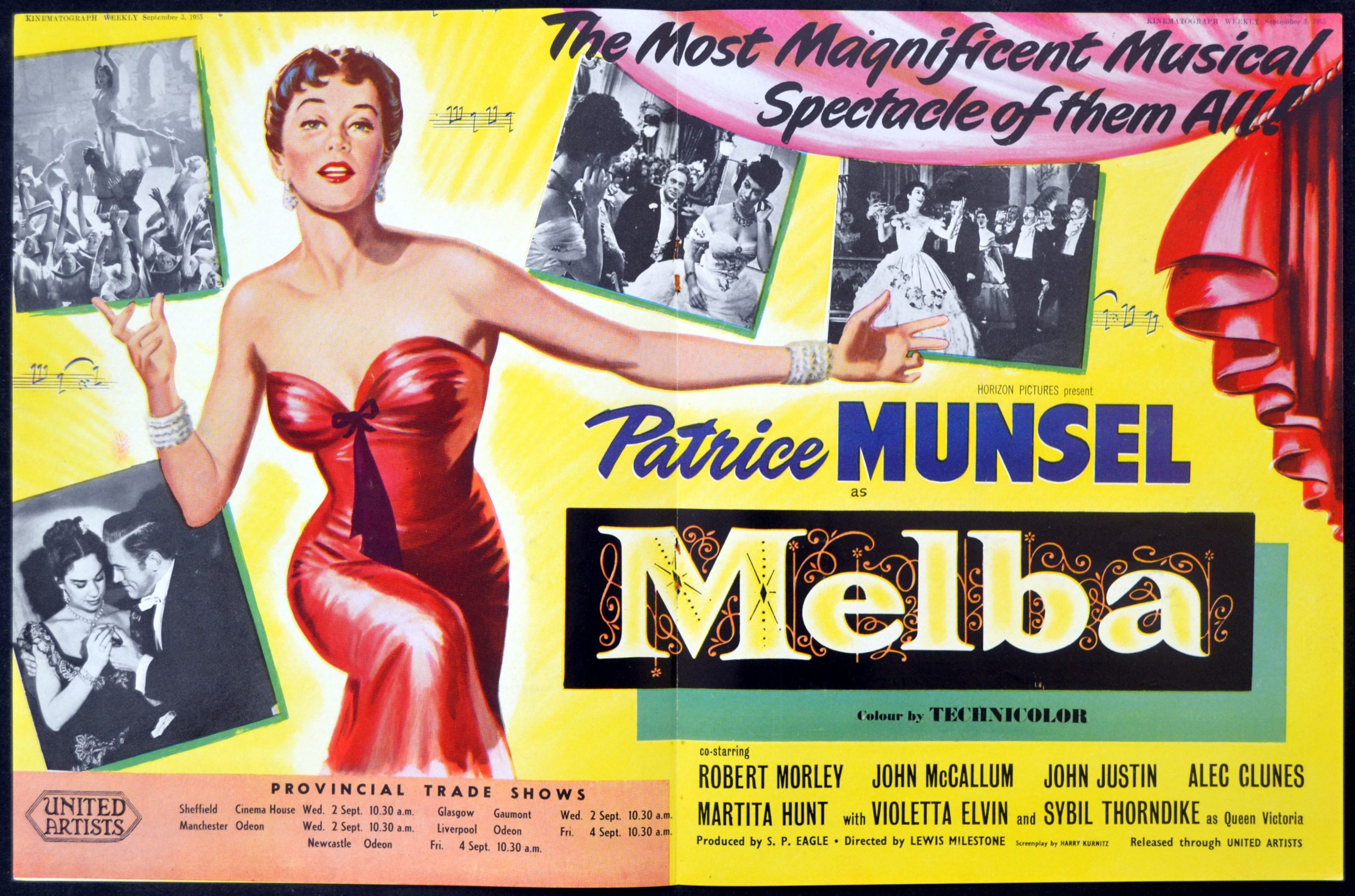 Original British 17 inch x 11 inch Trade Advertisement from Kinematograph Weekly for the 1953 Lewis Milestone Musical MELBA starring Patrice Munsel, Robert Morley, John McCallum, John Justin, Alec Clunes, Martita Hunt, Sybil Thorndike, Joseph Tomelty, Beatrice Varley and Theodore Bikel.