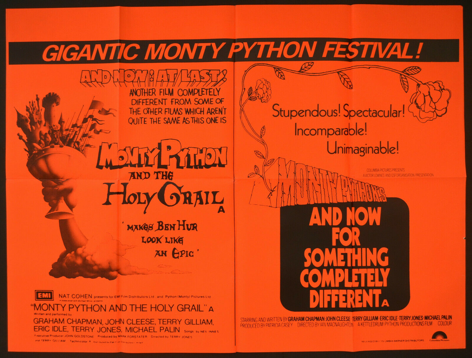 Original British 30 inch x 40 inch Double Bill Quad Poster for the 1975 Terry Gilliam & Terry Jones Medieval Comedy MONTY PYTHON AND THE HOLY GRAIL starring Graham Chapman (as King Arthur), John Cleese (as Sir Lancelot/The Black Knight/Tim the Enchanter), Terry Gilliam, Eric Idle, Terry Jones, Michael Palin (as Sir Galahad), Carol Cleveland, Connie Booth and John Young PLUS the 1971 Terry Gilliam & Ian MacNaughton Comedy Anthology AND NOW FOR SOMETHING COMPLETELY DIFFERENT starring Graham Chapman, John Cleese, Terry Gilliam, Eric Idle, Terry Jones, and Michael Palin.