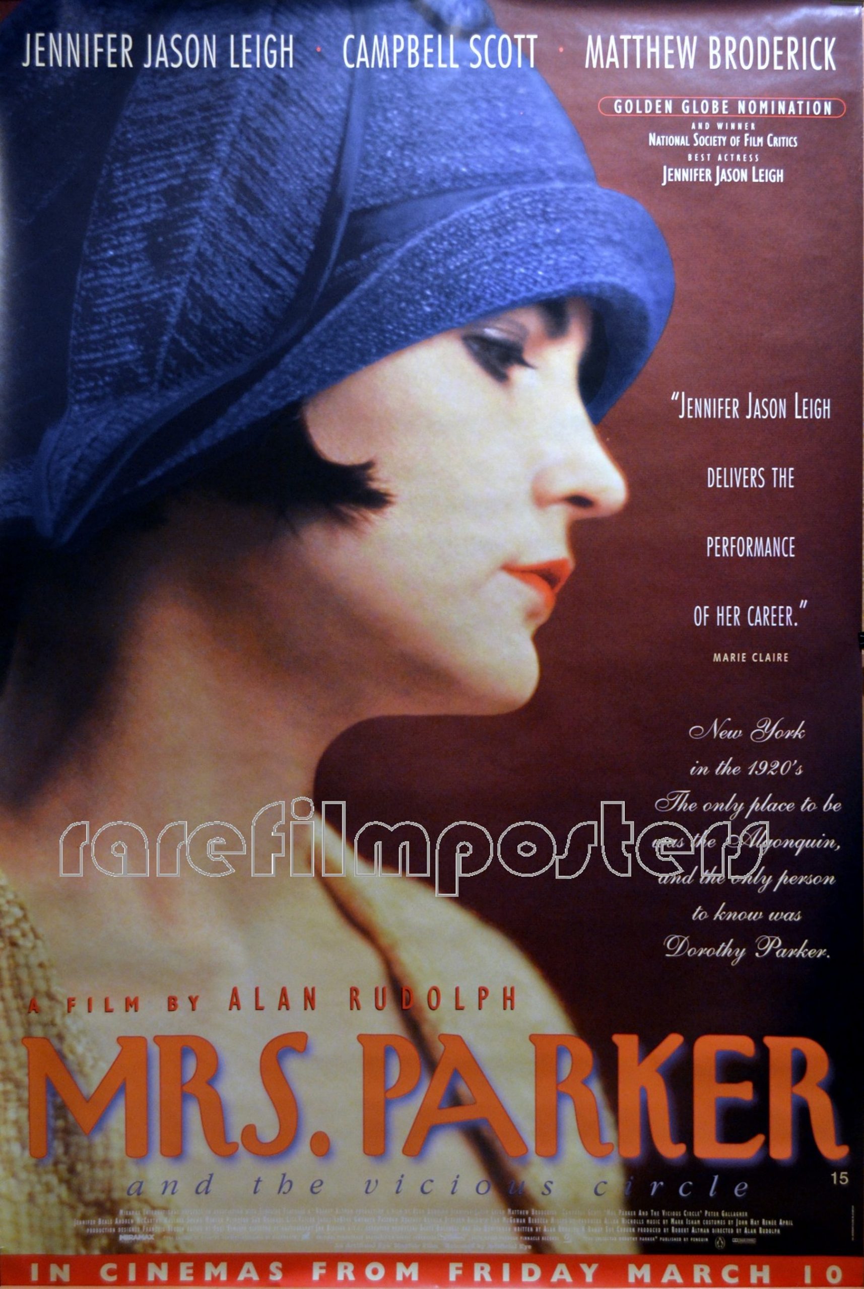 Original British 40 inch x 60 inch Poster for the 1994 Alan Rudolph Drama MRS PARKER & THE VICIOUS CIRCLE starring Jennifer Jason Leigh, Matthew Broderick, Campbell Scott and Peter Gallagher.