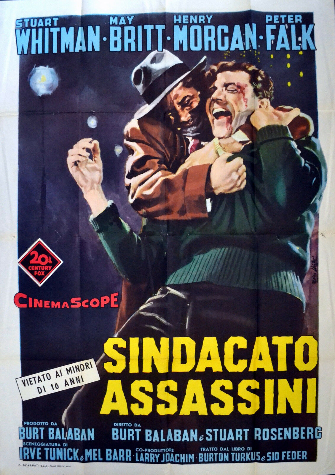 Original Italian 39 inch x 55 inch 2 Fogli Poster for the 1960 Burt Balaban & Stuart Rosenberg Crime Drama MURDER, INC., based on the book by Burton Turkus and starring Stuart Whitman, May Britt, Henry Morgan, David J. Stewart as Lepke Buchalter, Morey Amsterdam, Peter Falk (nominated for Best Supporting Actor Academy Award in the key role of Abe Reles), Simon Oakland, Sarah Vaughan, Vincent Gardenia, Sylvia Miles and Seymour Cassel.