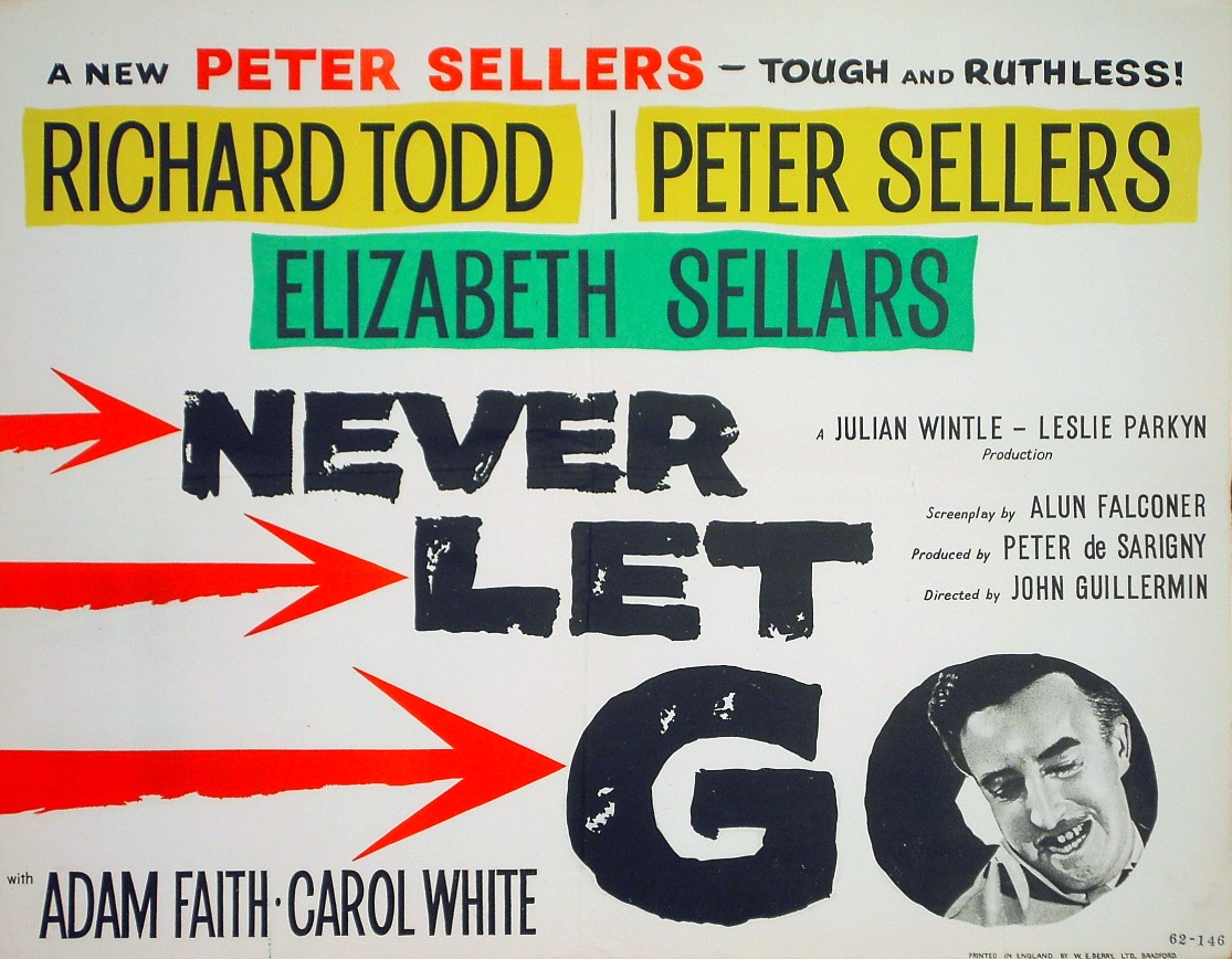 Original British 22 inch x 28 inch Half Sheet Poster for the 1960 John Guillermin Drama NEVER LET GO, with a screenplay by Alun Falconer and starring Richard Todd, Peter Sellers, Elizabeth Sellars, Adam Faith, Carol White, Mervyn Johns, Noel Willman, David Lodge, Peter Jones, Nigel Stock and John Le Mesurier.