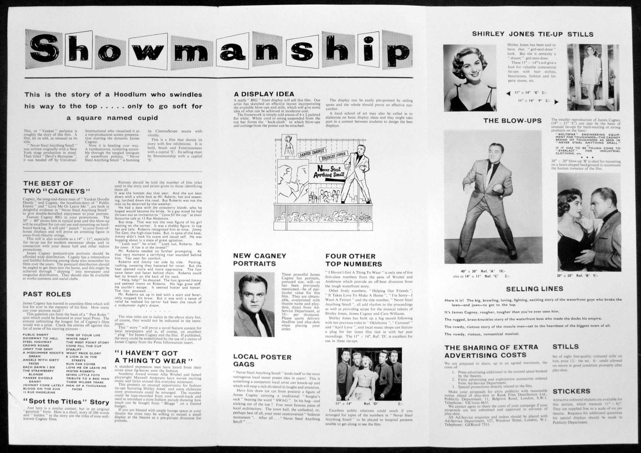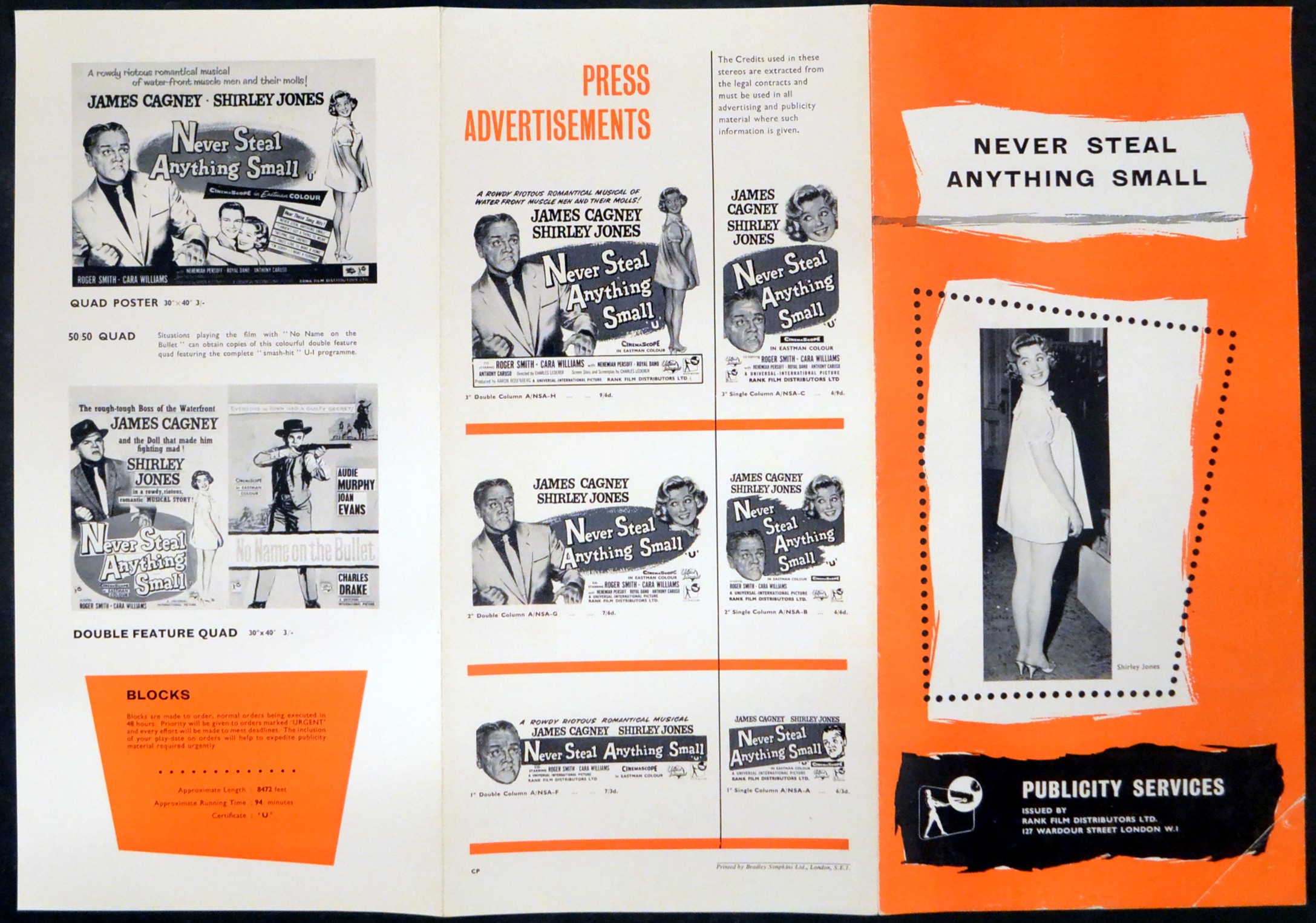 Original British 13 1/2 inch x 6 1/2 inch 6 Page illustrated Pressbook for the 1959 Charles Lederer New York Musical Comedy NEVER STEAL ANYTHING SMALL starring James Cagney, Shirley Jones, Roger Smith, Cara Williams, Nehemiah Persoff, Royal Dano, Anthony Caruso and Virginia Vincent.