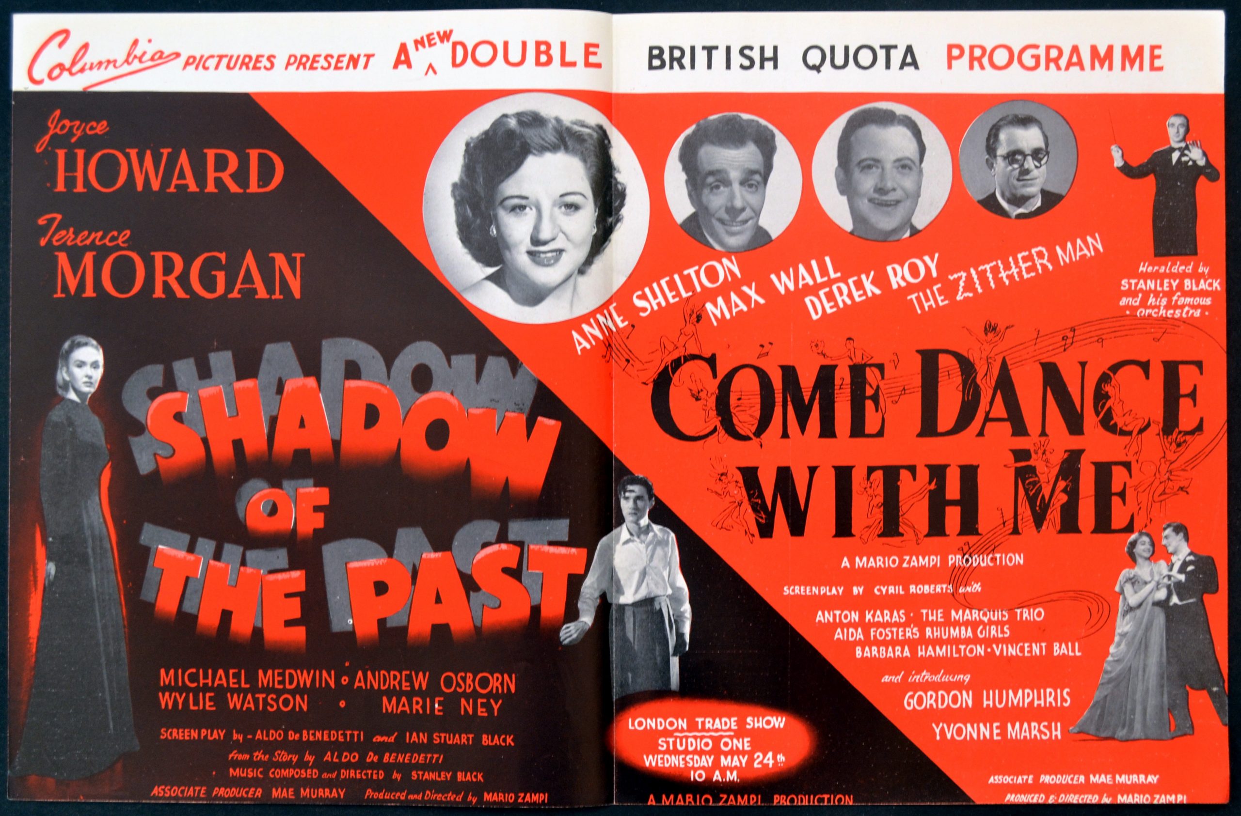 On the reverse is the 11 inch x 17 inch Trade Advertisement for the 1950 Mario Zampi Comedy COME DANCE WITH ME starring Max Wall, Anne Shelton, Derek Roy Anton Karas, The Marquis Trio, Aida Foster’s Rhumba Girls, Barbara Hamilton, Vincent Ball, Gordon Humphris and Yvonne Marsh AND the 1950 Mario Zampi Crime Drama SHADOW OF THE PAST starring Joyce Howard, Terence Morgan, Michael Medwin, Andrew Osborn, Wylie Watson and Marie Ney.