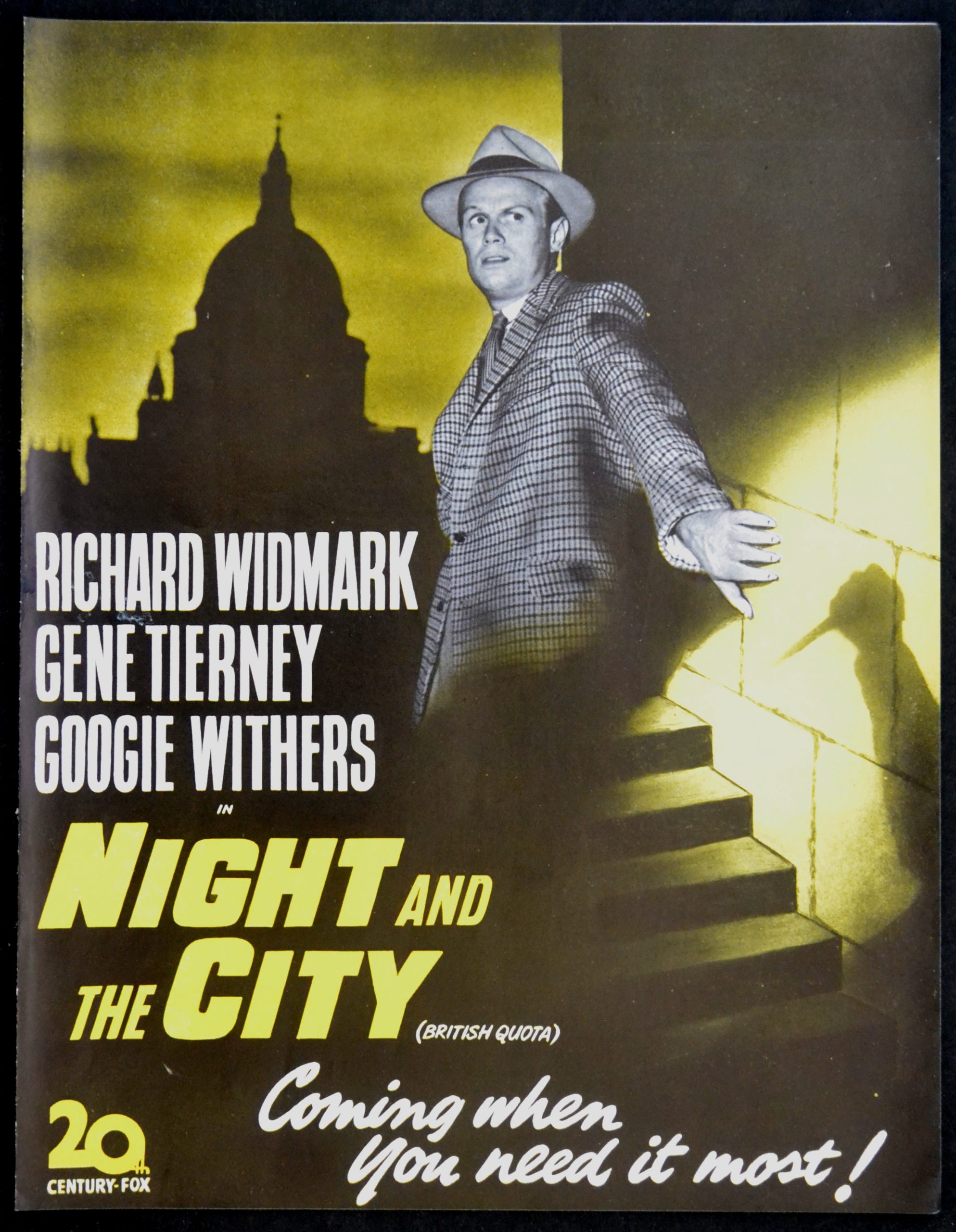 Original British 11 inch x 8 1/2 inch Double-Sided Trade Advertisement from Kinematograph Weekly for the 1950 Jules Dassin Film Noir NIGHT AND THE CITY, based upon the novel by Gerald Kersh and starring Richard Widmark, Gene Tierney, Googie Withers, Hugh Marlowe, Francis L. Sullivan, Herbert Lom, Stanislaus Zbyszko, Mike Mazurki, Charles Farrell, Ada Reeve, Ken Richmond, Alan Tilvern, Peter Butterworth, Naomi Chance and Edward Chapman.
