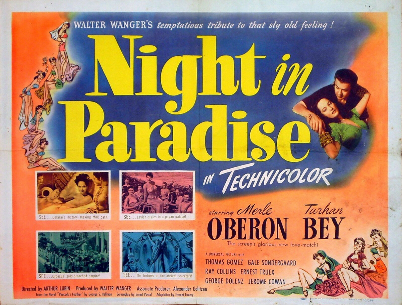Original U.S. 22 inch x 28 inch Half Sheet Poster for the 1946 Arthur Lubin Comedy Drama A NIGHT IN PARADISE starring Merle Oberon, Turhan Bey, Thomas Gomez, Gale Sondergaard, Ray Collins, Ernest Truex, George Dolenz, John Litel, Jerome Cowan and Douglass Dumbrille.