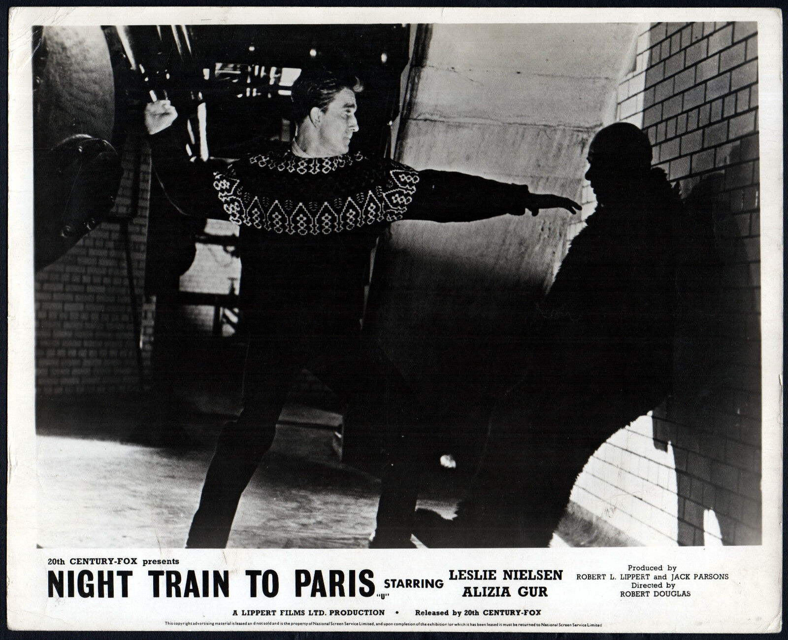 Original British 10 inch by 8 inch Front-of-House Still (Lobby Card) of LESLIE NIELSEN in the 1964 Robert Douglas Thriller NIGHT TRAIN TO PARIS.