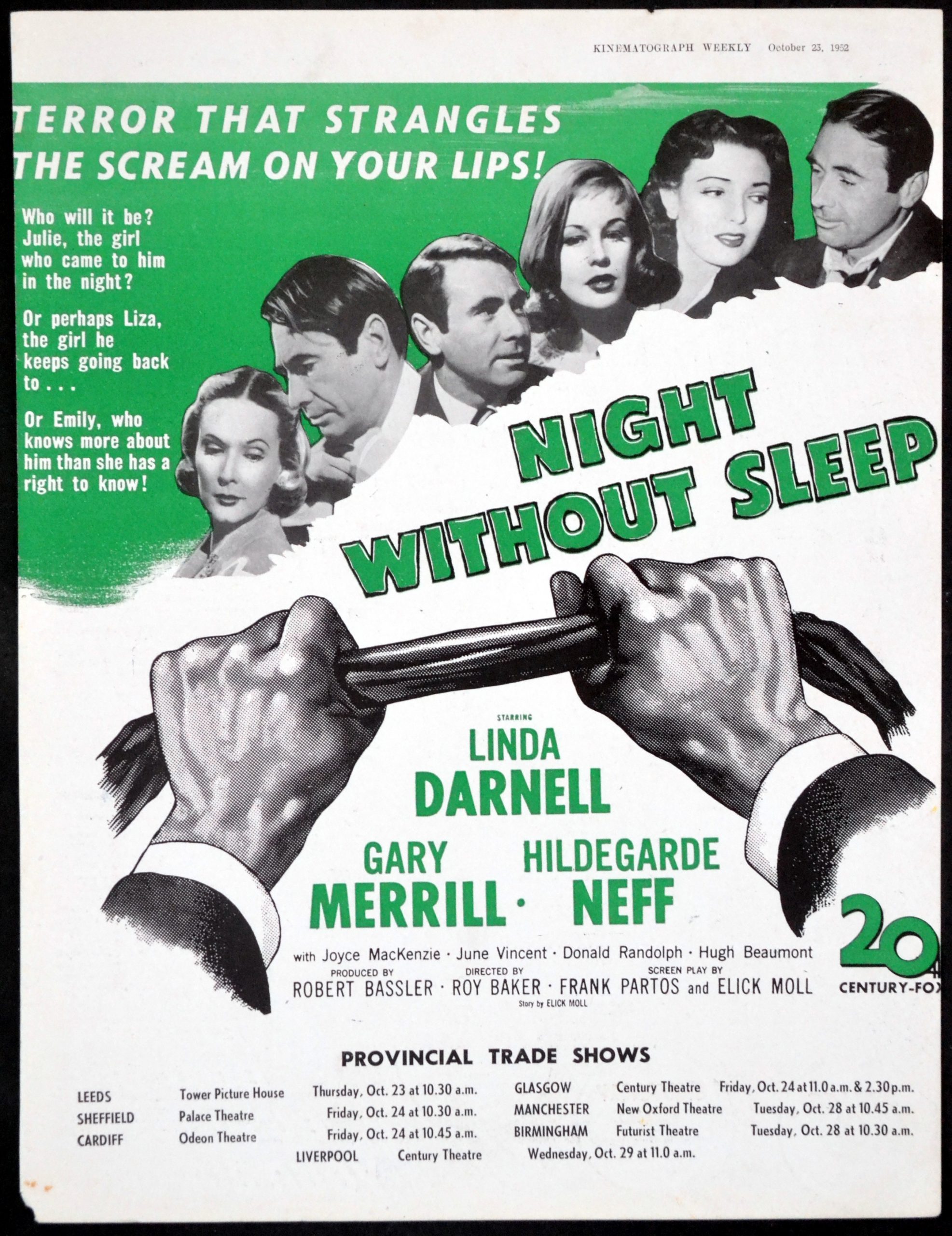 Original British 11 inch x 8 1/2 inch Trade Advertisement from Kinematograph Weekly for the 1952 Roy Ward Baker Film Noir NIGHT WITHOUT SLEEP starring Linda Darnell, Gary Merrill, Hildegarde Neff, Joyce Mackenzie, June Vincent, Donald Randolph and Hugh Beaumont.