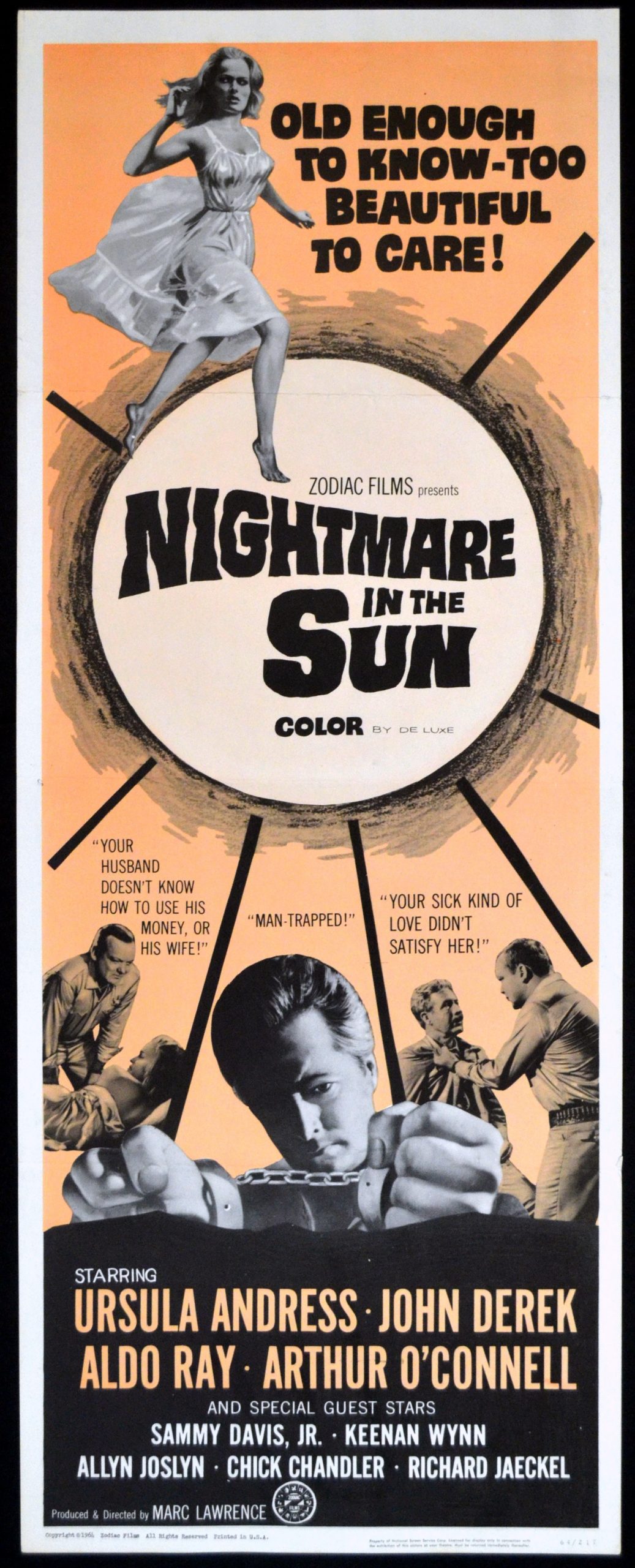 Original U.S. 14 inch x 36 inch Insert Poster for the 1965 John Derek & Marc Lawrence Crime Drama NIGHTMARE IN THE SUN starring Ursula Andress, John Derek, Sammy Davis Jr., Robert Duvall and Aldo Ray.