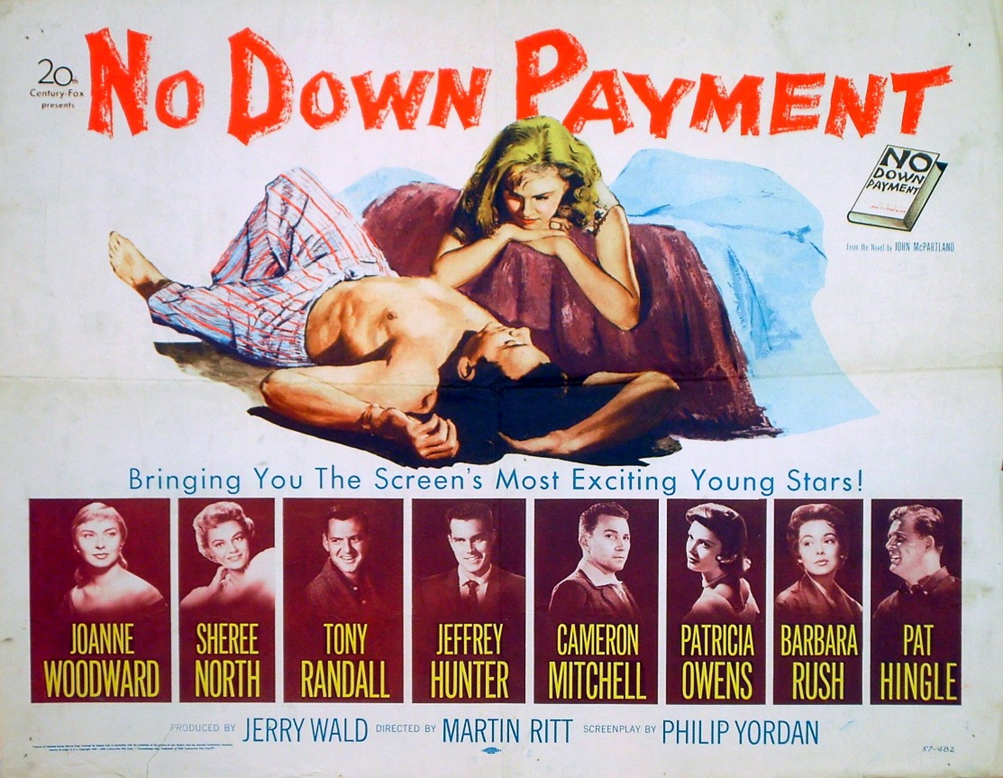 Original U.S. 22 inch x 28 inch Half Sheet Poster for the 1957 Martin Ritt Drama NO DOWN PAYMENT, based on the novel by John McPartland and starring Joanne Woodward, Sheree North, Tony Randall, Jeffrey Hunter and Cameron Mitchell.