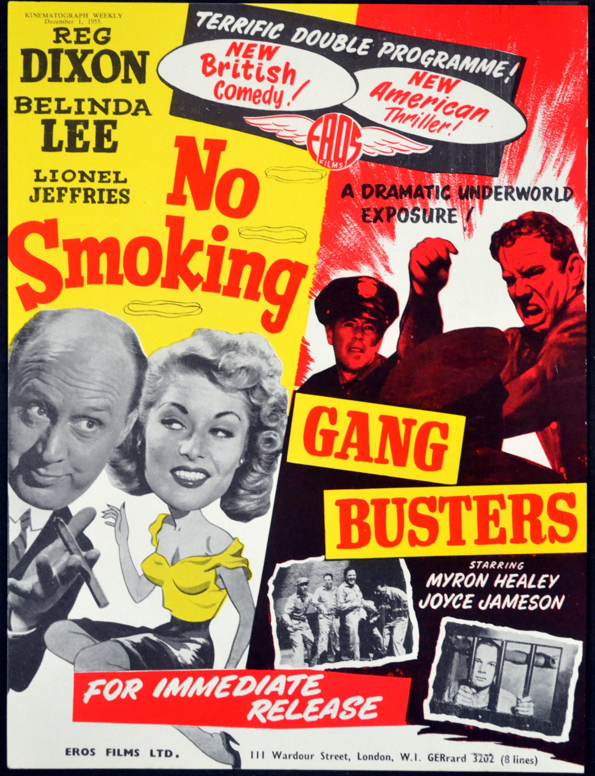 Original British 11 inch x 8 3/8 inch Double-Bill Trade Advertisement from Kinematograph Weekly for the 1955 Henry Cass Comedy NO SMOKING, from the original play by G.H. Moresby-White & Rex Rienits and starring Belinda Lee, Reg Dixon, Lionel Jeffries, Peter Martyn and Alexander Gauge.