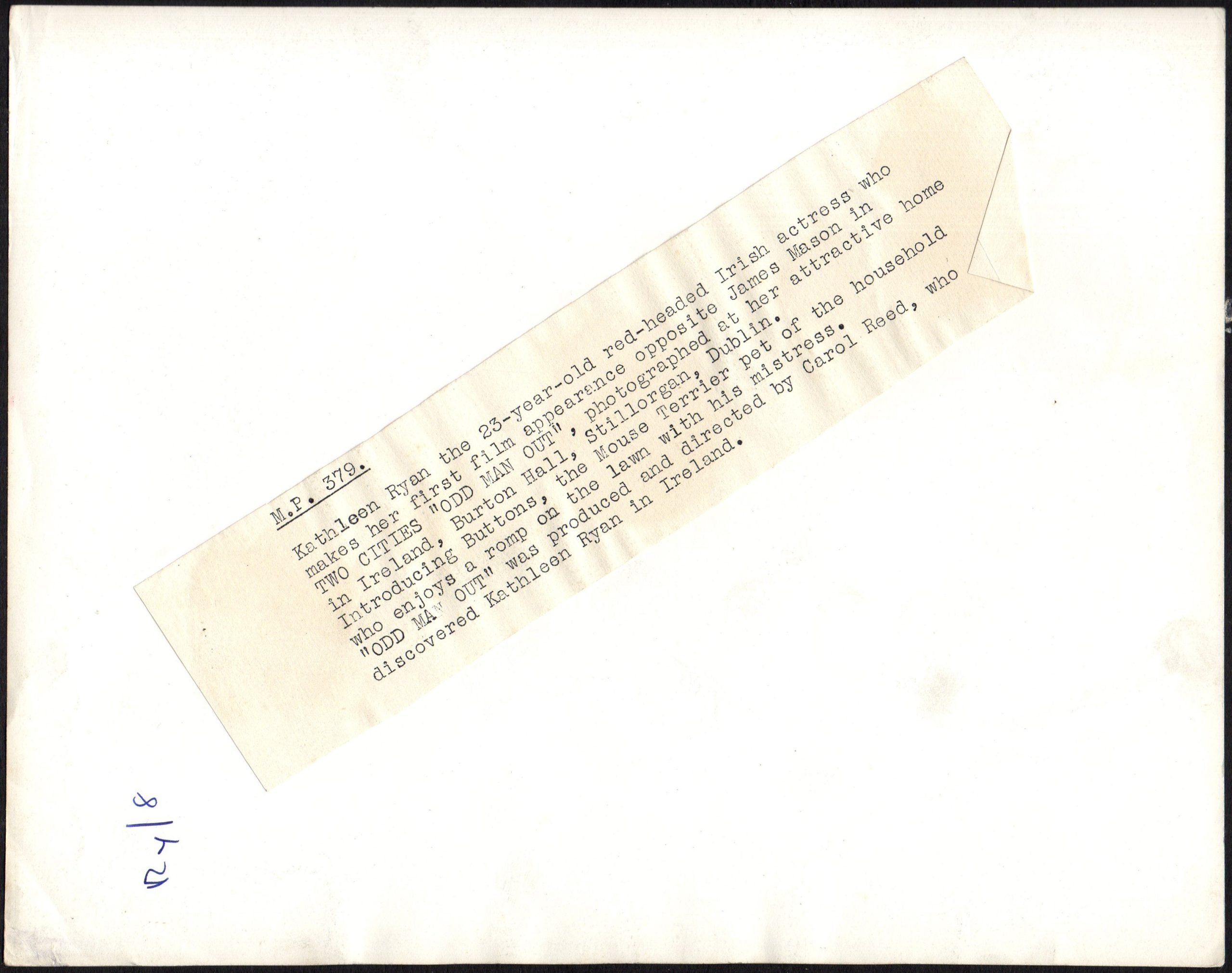 Stills photographer on ODD MAN OUT was Davis Boulton