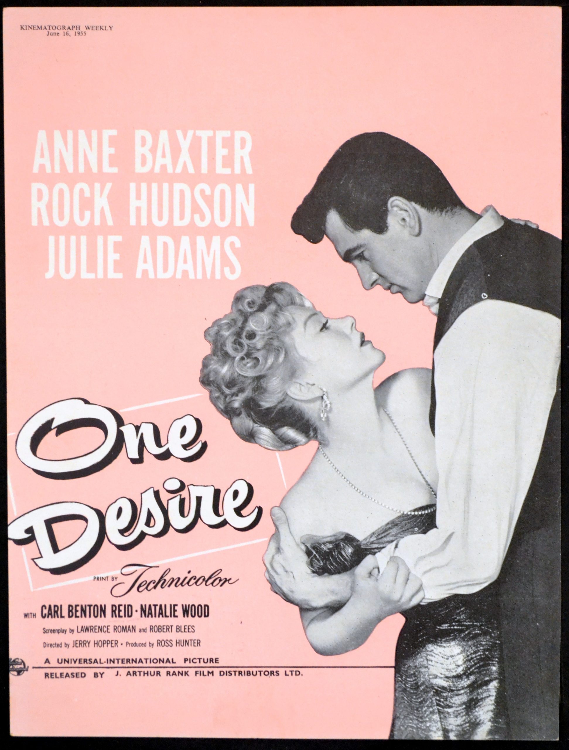 Original British 11 inch x 8 1/2 inch Trade Advertisement from Kinematograph Weekly for the 1955 Jerry Hopper Romantic Drama ONE DESIRE, based on the novel by Conrad Richter and starring Anne Baxter, Rock Hudson, Julie Adams, Carl Benton Reid, Natalie Wood, William Hopper, Betty Garde, Vera Francis and Edward Earle.