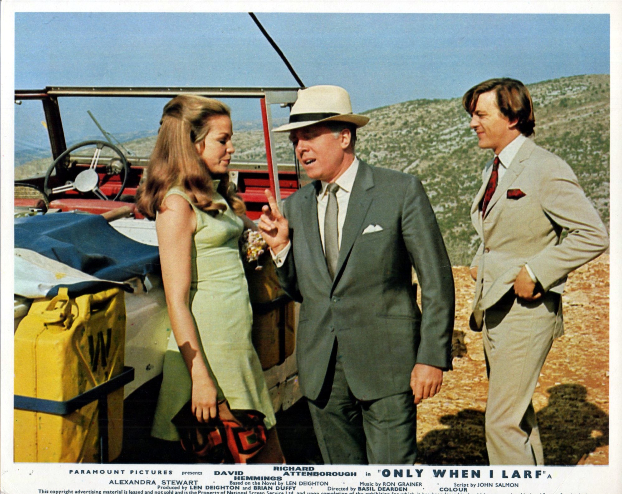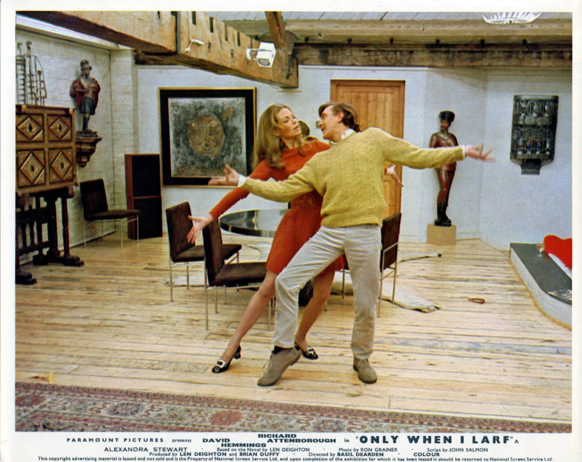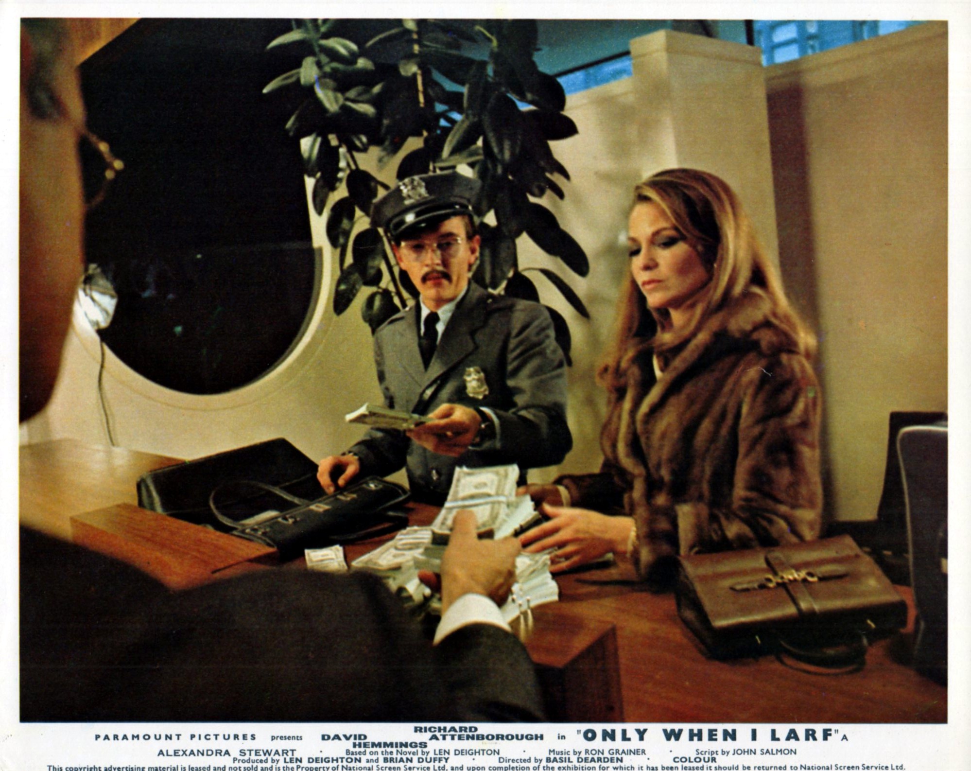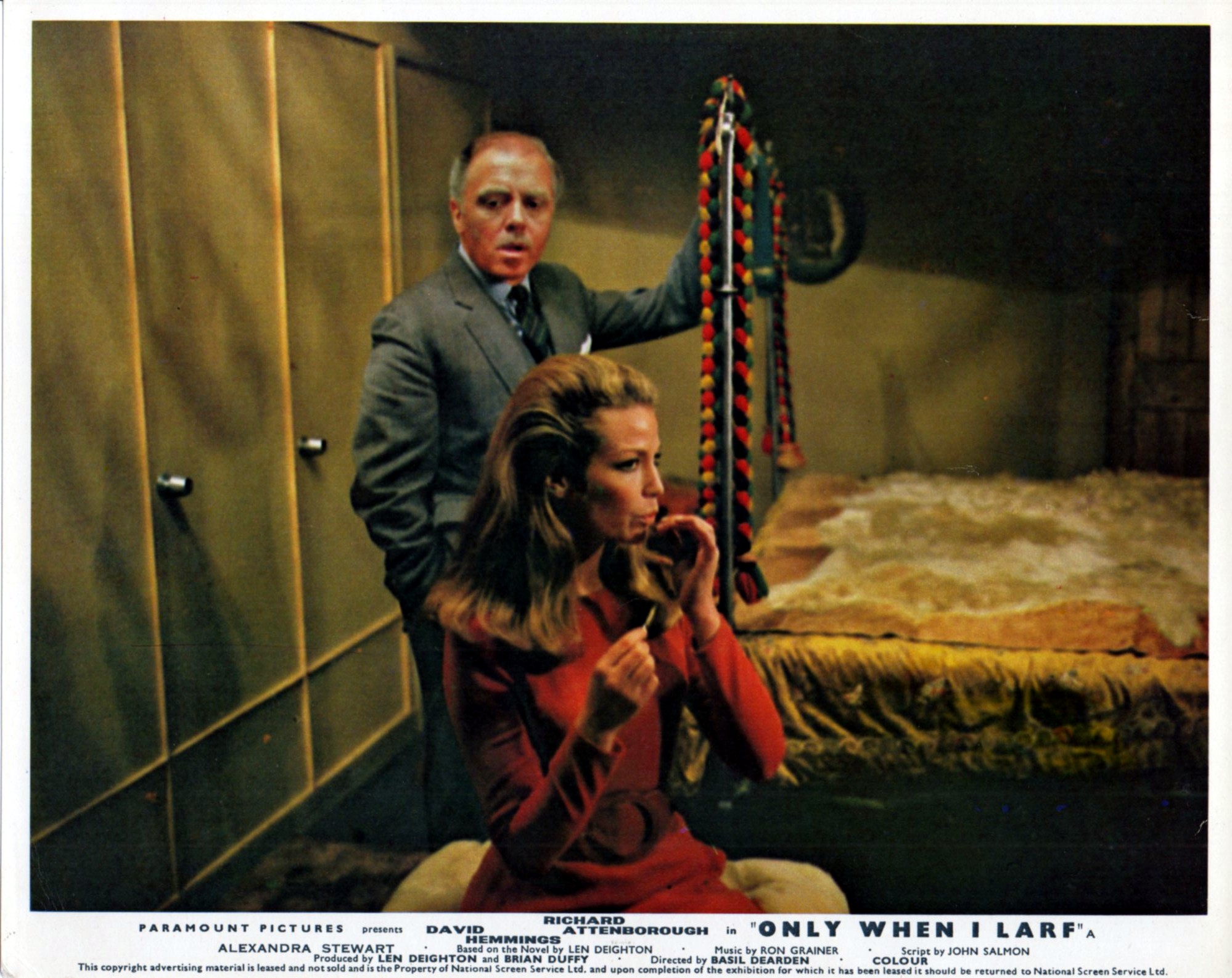 Original British 10 inch by 8 inch Set of 8 Front-of-House Stills (Lobby Cards) for the 1968 Basil Dearden Crime Comedy ONLY WHEN I LARF, based on the novel by Len Deighton and starring Richard Attenborough, David Hemmings and Alexandra Stewart.