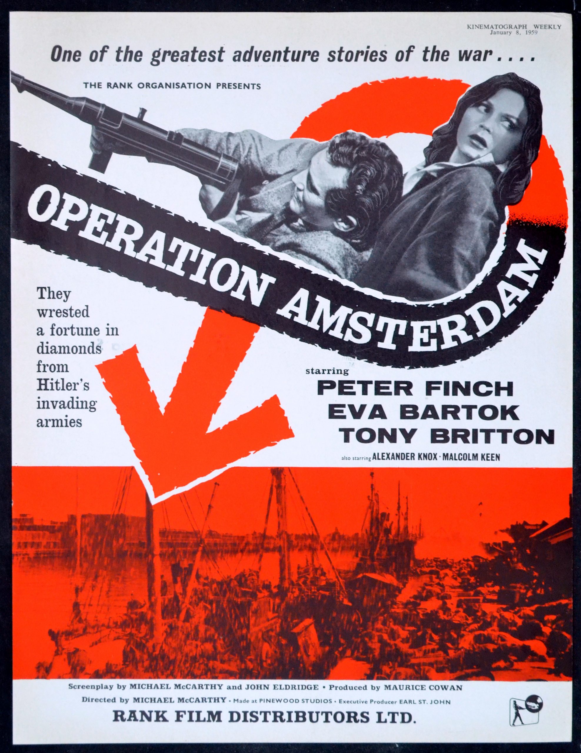 Original British 11 inch x 8 1/2 inch Double-Sided Trade Advertisement from Kinematograph Weekly for the 1958 Michael McCarthy War Film OPERATION AMSTERDAM, based on a true story as described in the book “Adventure in Diamonds” by David E Walker and starring Peter Finch, Eva Bartok, Tony Britton, Alexander Knox, Malcolm Keen, Christopher Rhodes, Alfred Burke, Carl Jaffe, John Horsley, Melvin Hayes, Oscar Quitak, George Pravda and John le Mesurier.