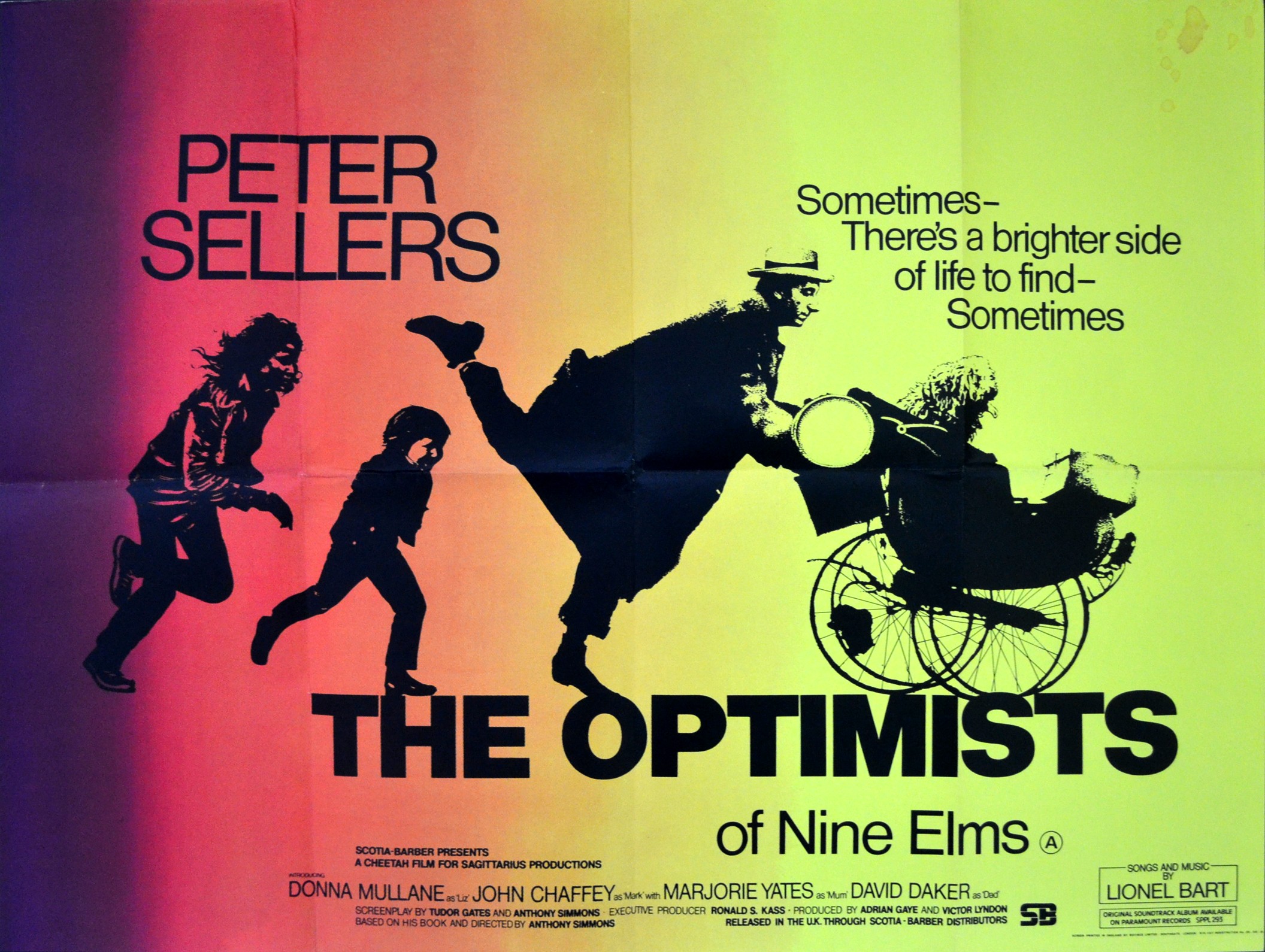 Original British 30 inch x 40 inch Quad Poster for the 1973 Anthony Simmons Drama THE OPTIMISTS OF NINE ELMS, based on the novel by Anthony Simmons and starring Peter Sellers, Donna Mullane, John Chaffey, Marjorie Yates, David Daker, Pat Ashton, Pat Beckett and Patricia Brake.