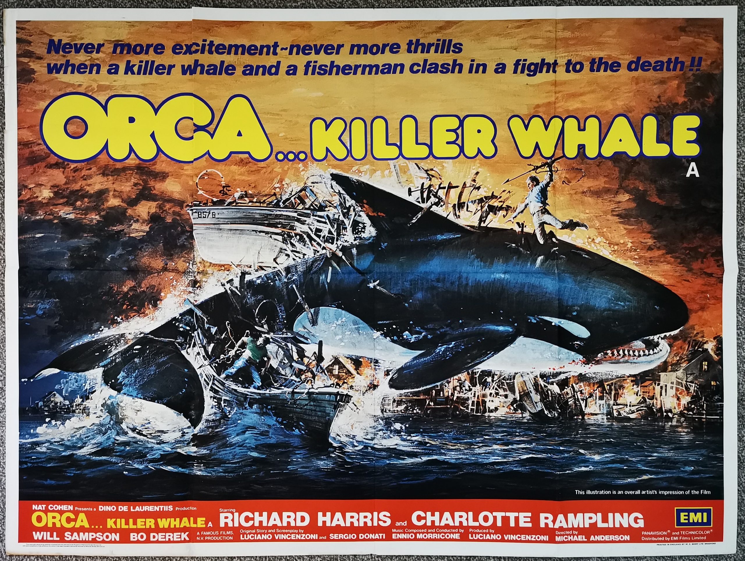 Original British 30 inch x 40 inch Quad Poster for the 1977 Michael Anderson Adventure ORCA… KILLER WHALE starring Richard Harris, Charlotte Rampling, Will Sampson, Bo Derek, Keenan Wynn, Robert Carradine and Scott Walker.