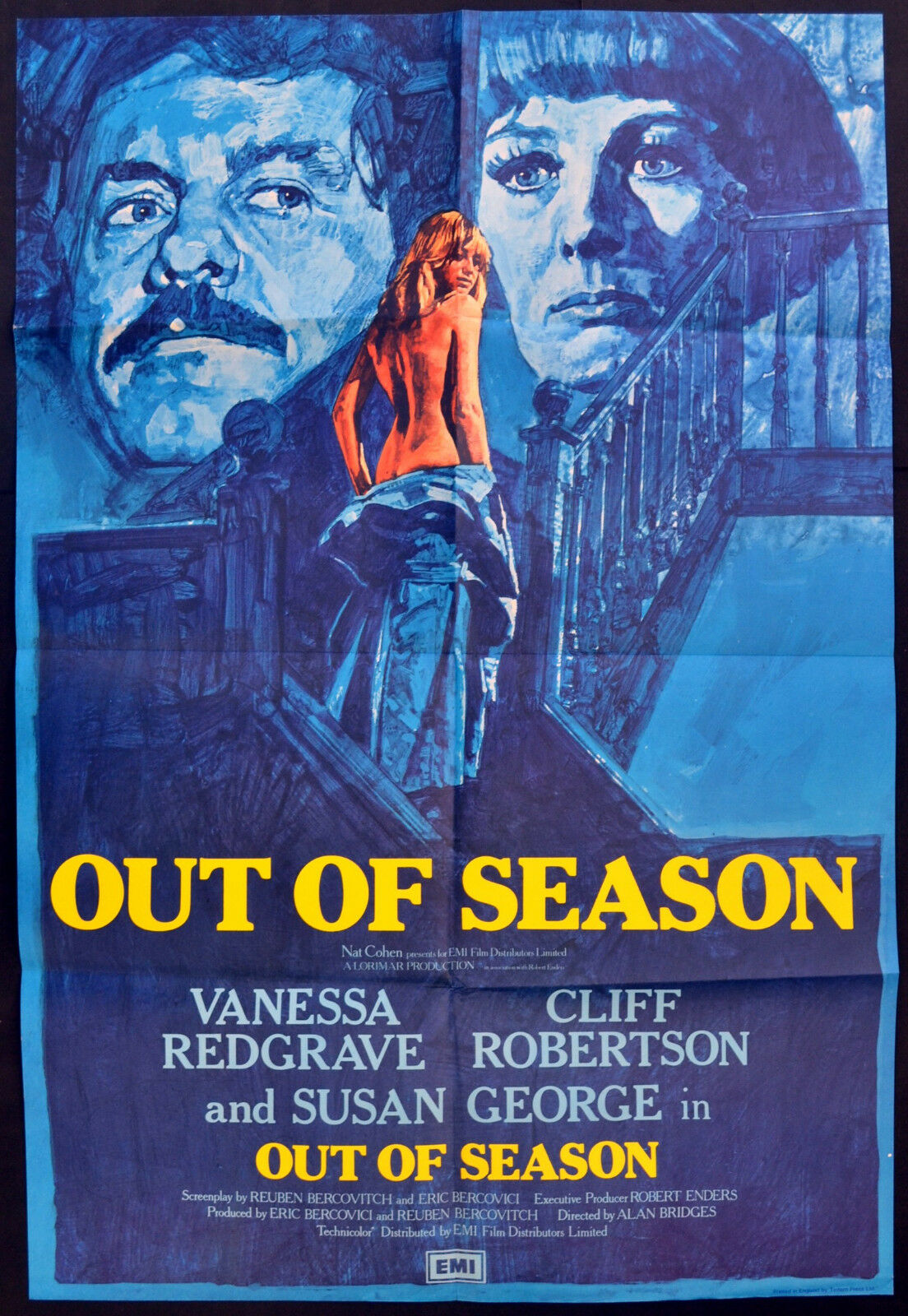 Original British 27 inch x 40 inch 1-Sheet Poster for the 1975 Alan Bridges Romantic Drama OUT OF SEASON starring Cliff Robertson, Vanessa Redgrave, Susan George, Edward Evans and Frank Jarvis.
