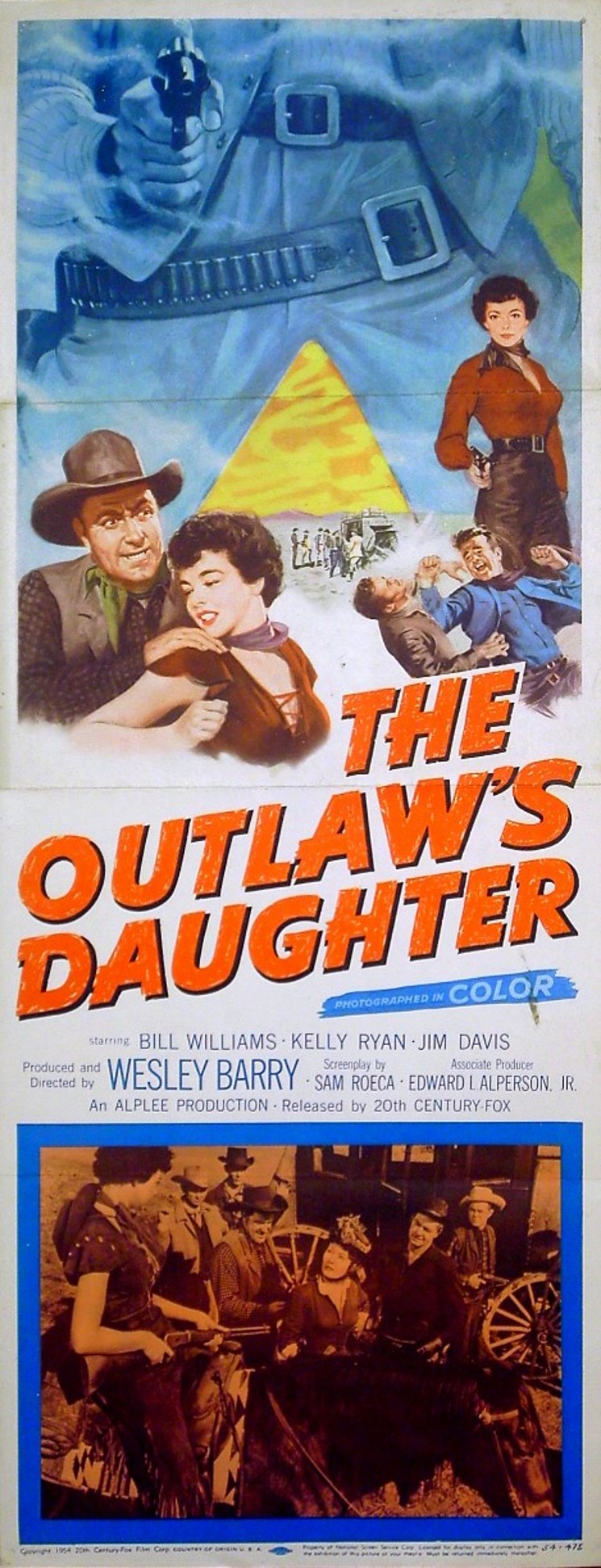 Original U.S. 14 inch x 36 inch Insert Poster for the 1954 Wesley Barry Western THE OUTLAW’S DAUGHTER starring Bill Williams, Kelly Ryan, Jim Davis, George Cleveland, Elisha Cook Jr., Guinn ‘Big Boy’ Williams, Sara Leigh and George Barrows.