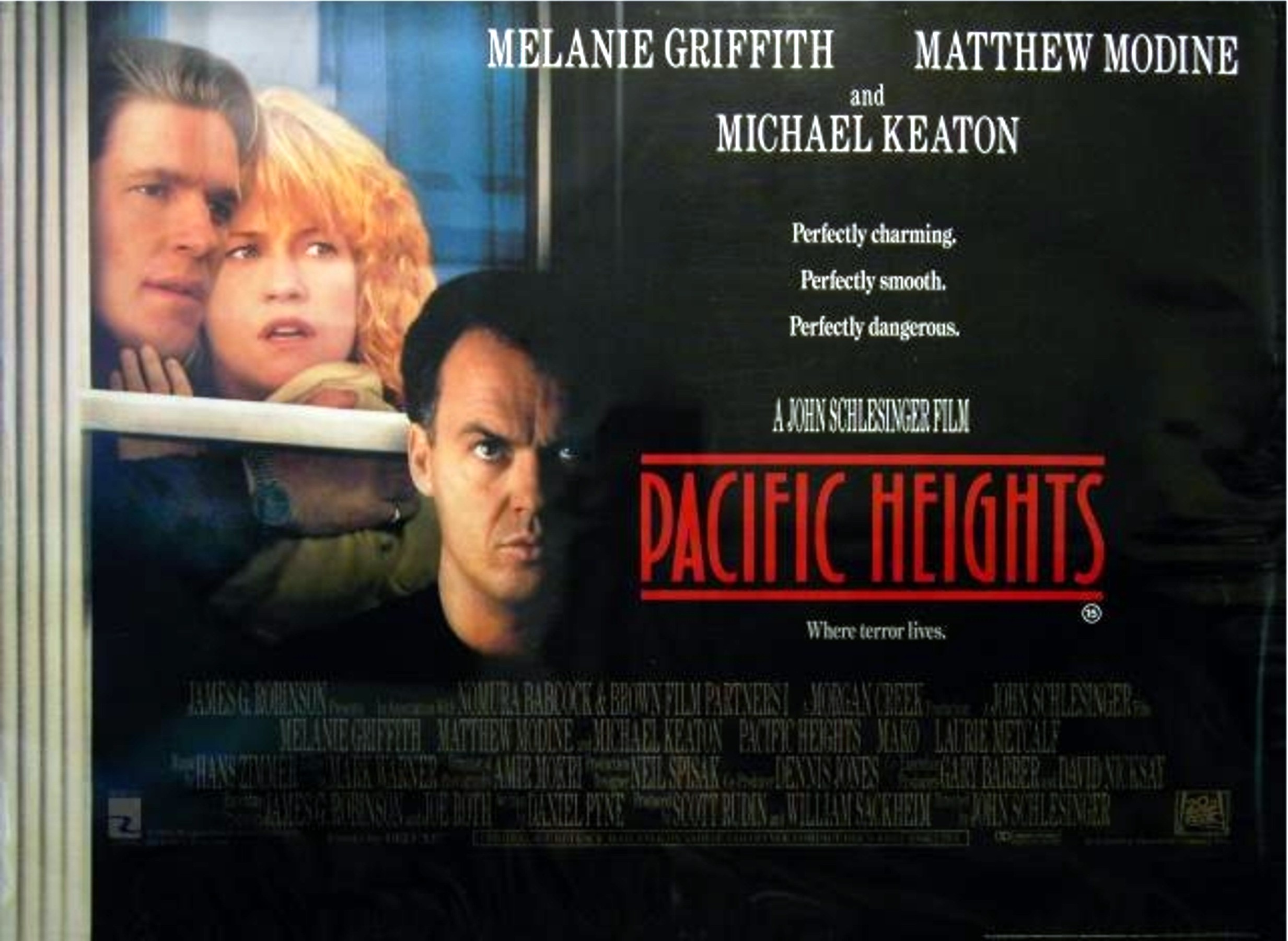 Original British 30 inch x 40 inch Quad Poster for the 1990 John Schlesinger Thriller PACIFIC HEIGHTS starring Melanie Griffith, Matthew Modine, Michael Keaton, Mako, Nabu McCarthy and Laurie Metcalf.