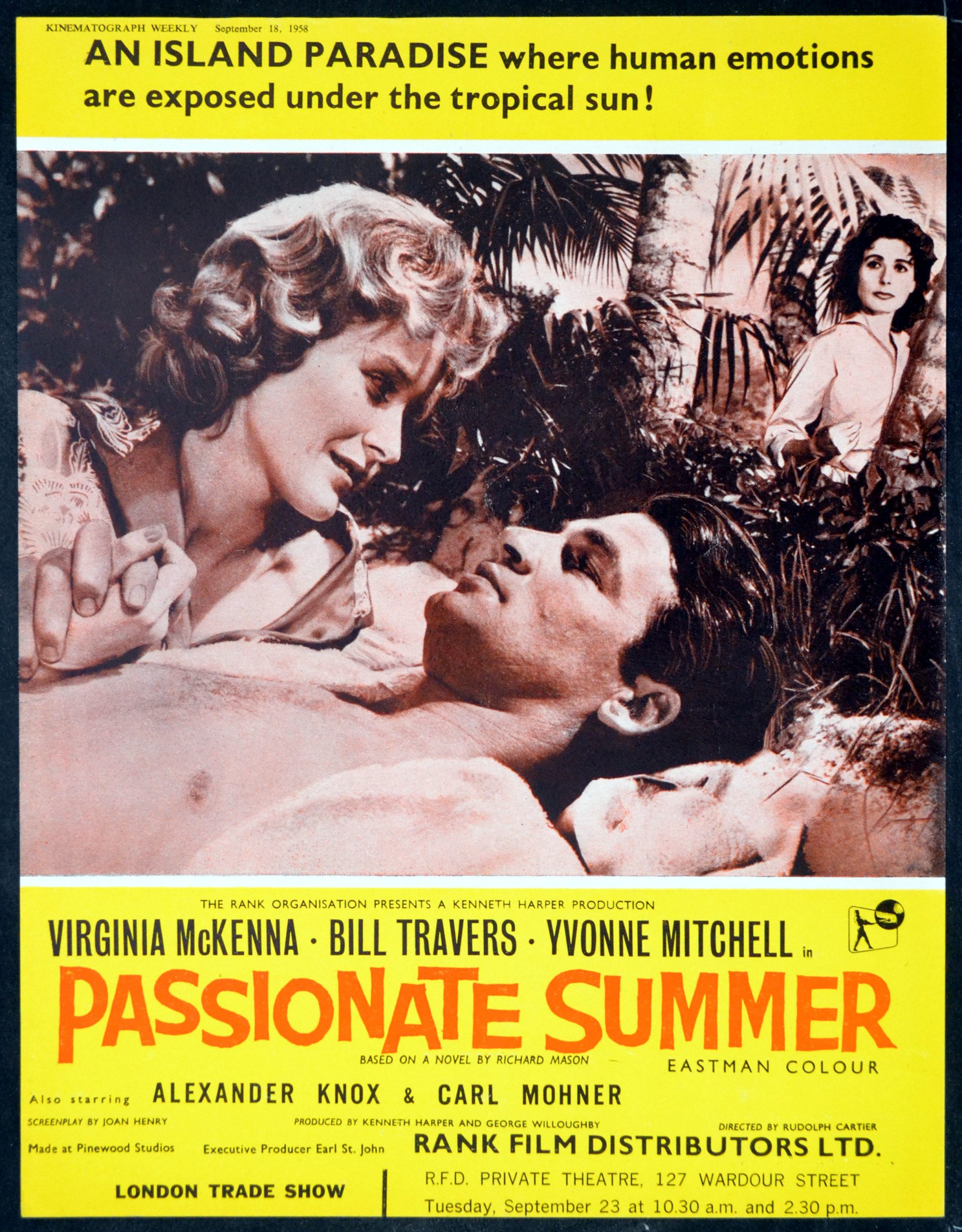 Original British 11 inch x 8 1/2 inch Trade Advertisement from Kinematograph Weekly for the 1958 Rudolph Cartier Romance PASSIONATE SUMMER, based on the novel by Richard Mason and starring Bill Travers, Virginia McKenna, Yvonne Mitchell, Alexander Knox, Carl Möhner and Guy Middleton.