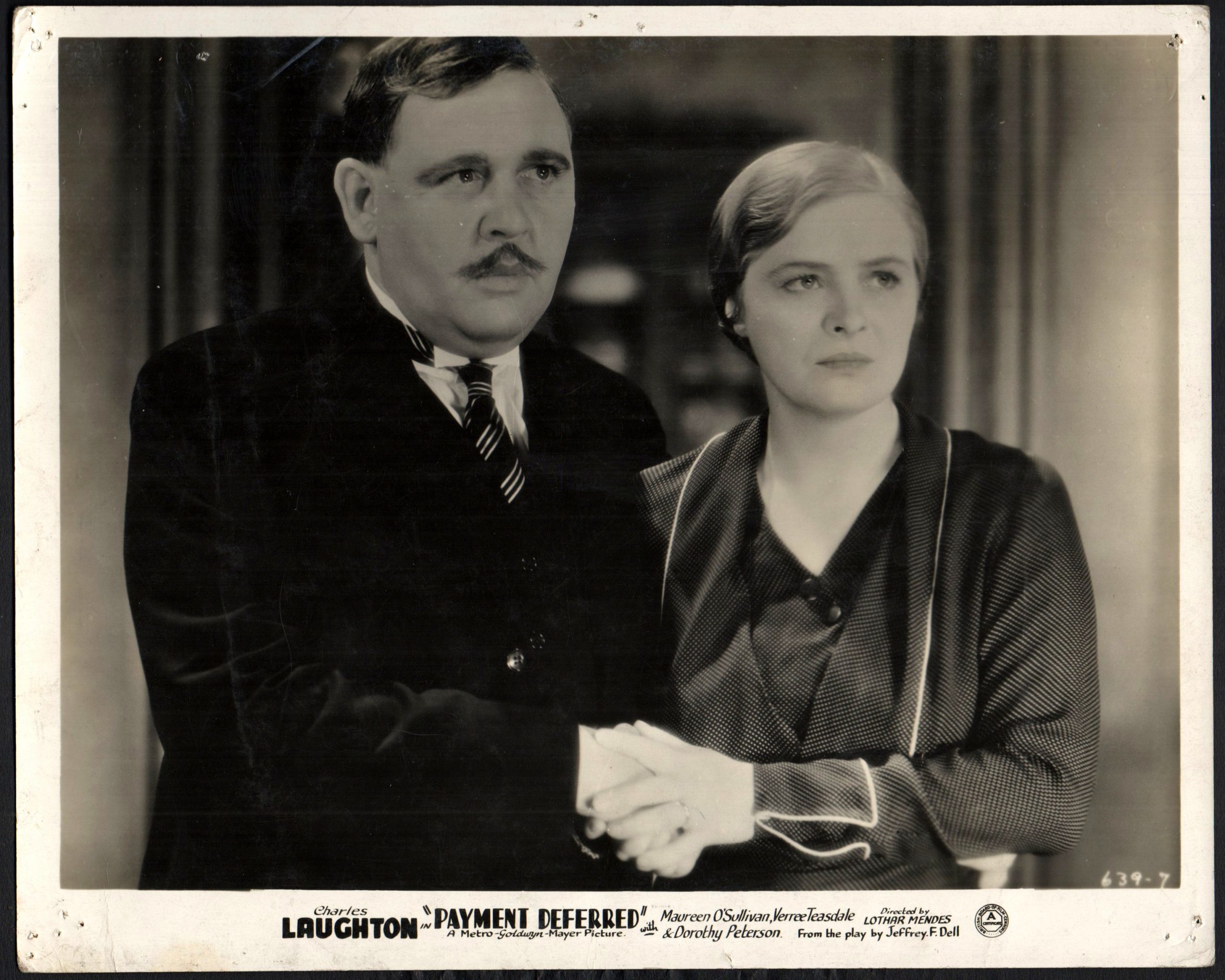 Original British 10 inch x 8 inch Front-of-House Still (Lobby Card) of CHARLES LAUGHTON & DOROTHY PETERSON in the 1932 Lothar Mendes Crime Drama PAYMENT DEFERRED, based on the novel by C.S. Forester and the play by Jeffrey Dell.
