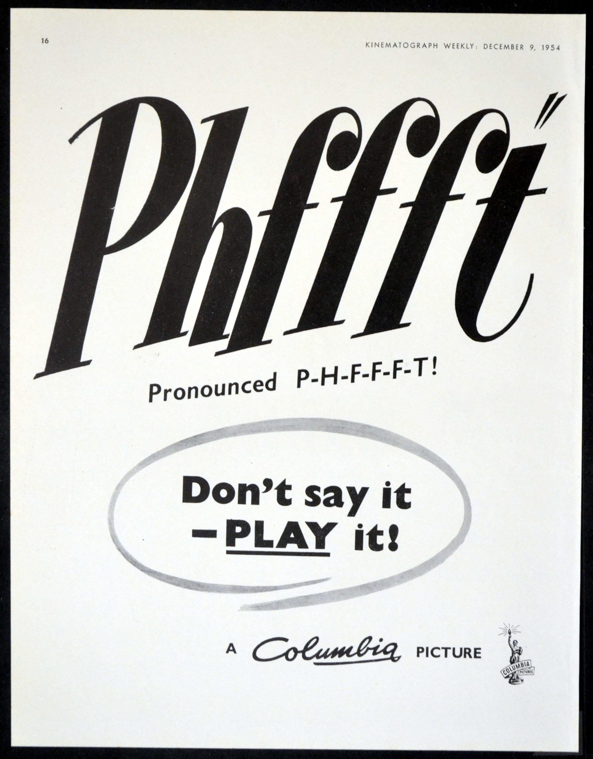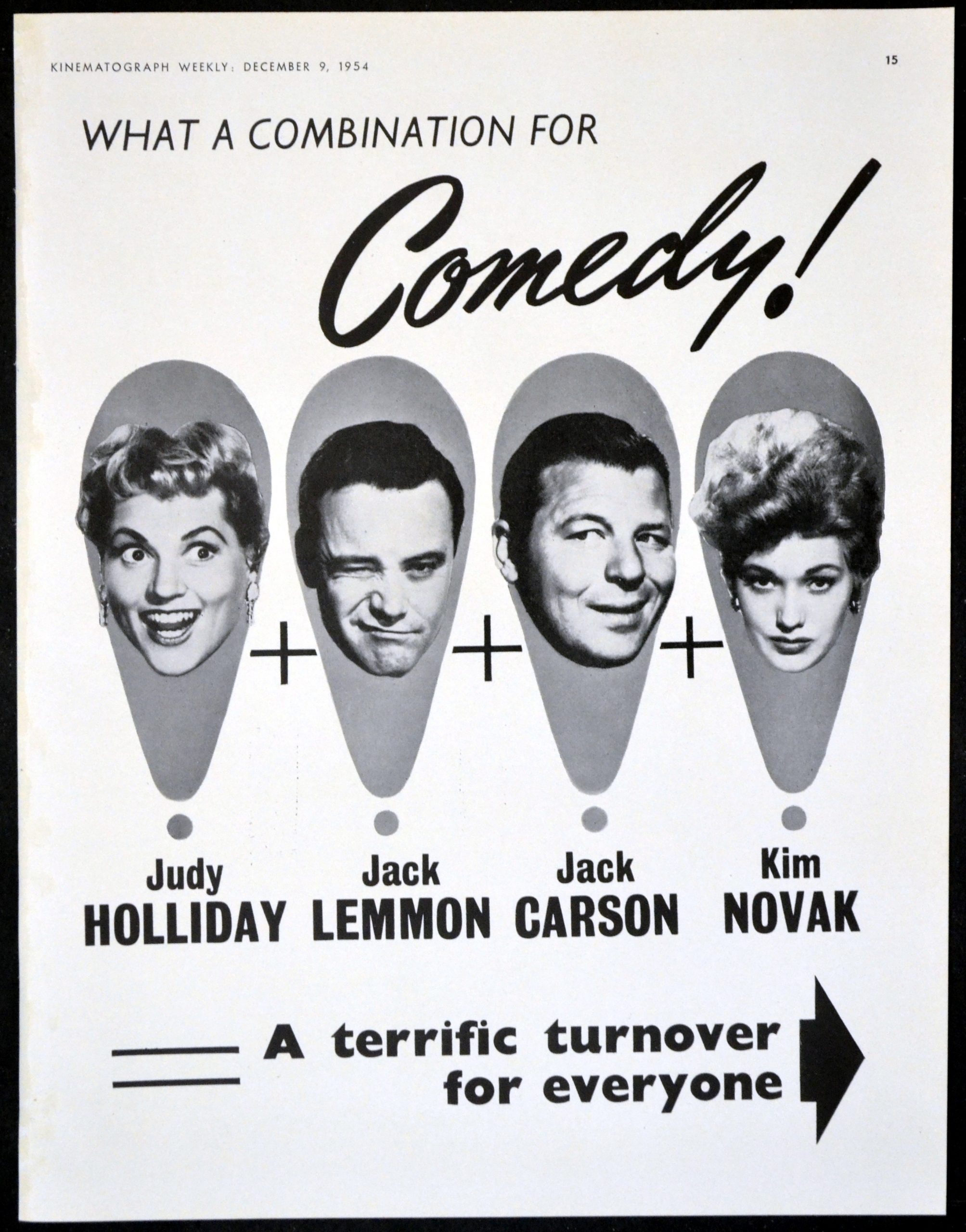 Original British 10 3/4 inch x 8 3/8 inch Double-Sided Trade Advertisement from Kinematograph Weekly for the 1954 Mark Robson Romantic Comedy PHFFFT starring Judy Holliday, Jack Lemmon, Jack Carson and Kim Novak.