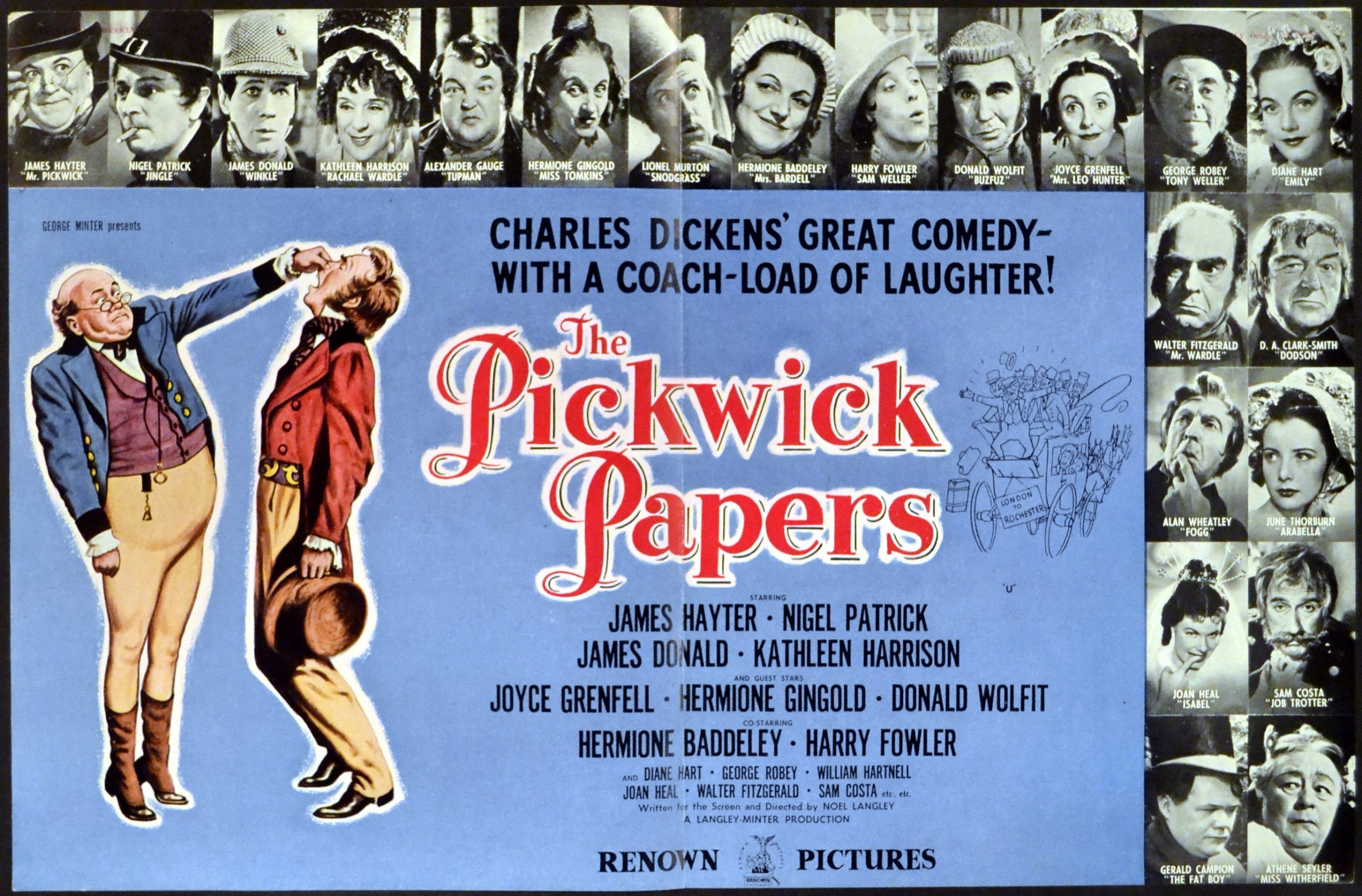Original British 11 1/4 inch by 17 inch Trade Advert from the Kinematograph Weekly for the 1952 Noel Langley Comedy THE PICKWICK PAPERS , based on the novel by Charles Dickens and starring James Hayter (in the title role as Samuel Pickwick), Nigel Patrick, James Donald, Kathleen Harrison, Joyce Grenefell, Hermione Gringold, Donald Wolfit, Hermione Baddeley, Harry Fowler, Diane Hart, George Robey, William Hartnell, Joan Heal, Walter Fitzgerald, Sam Cost, Lionel Murton and Alexander Gauge.