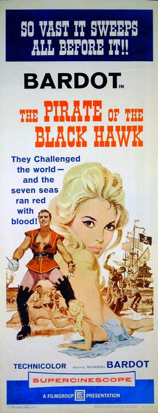 Original U.S. 14 inch x 36 inch Insert Poster for the 1958 Sergio Grieco Adventure THE PIRATE OF THE BLACK HAWK (IL PIRATA DELLO SPARVIERO NERO) starring Gerard Landry and Mijanou Bardot
