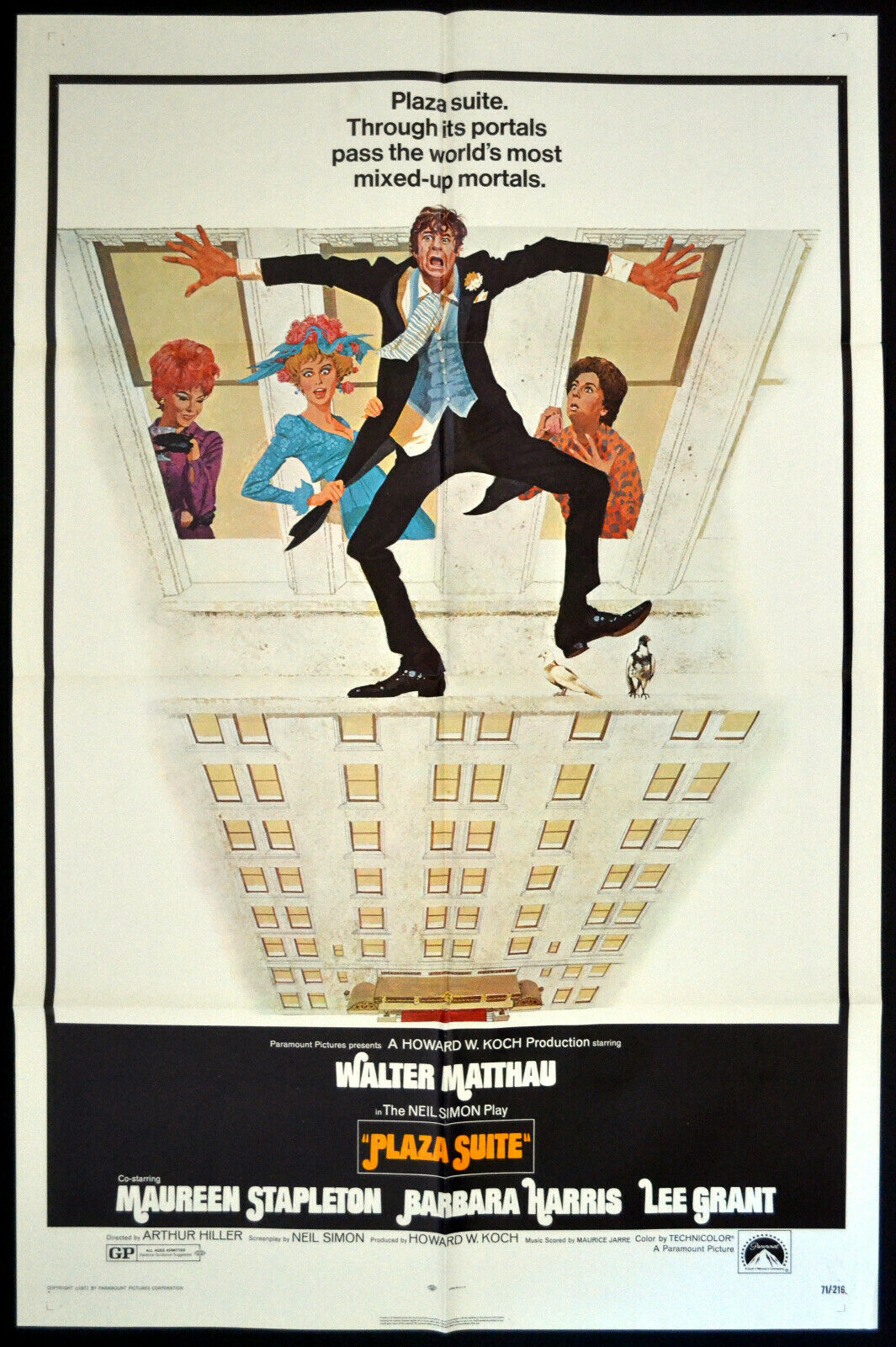 Original U.S. 27 inch x 41 inch 1-Sheet Poster for the 1971 Arthur Hiller Comedy PLAZA SUITE, based on the play by Neil Simon and starring Walter Matthau, Maureen Stapleton, Barbara Harris, Lee Grant, Louise Sorel and Jose Ocasio.