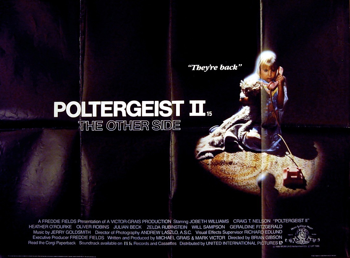 Original British 30 inch x 40 inch Quad Poster for the 1986 Brian Gibson Horror Movie POLTERGEIST II: THE OTHER SIDE starring Craig T. Nelson, JoBeth Williams, Heather O’Rourke, Oliver Robins, Zelda Rubinstein, Will Sampson, Julian Beck, Geraldine Fitzgerald and John P. Whitecloud.