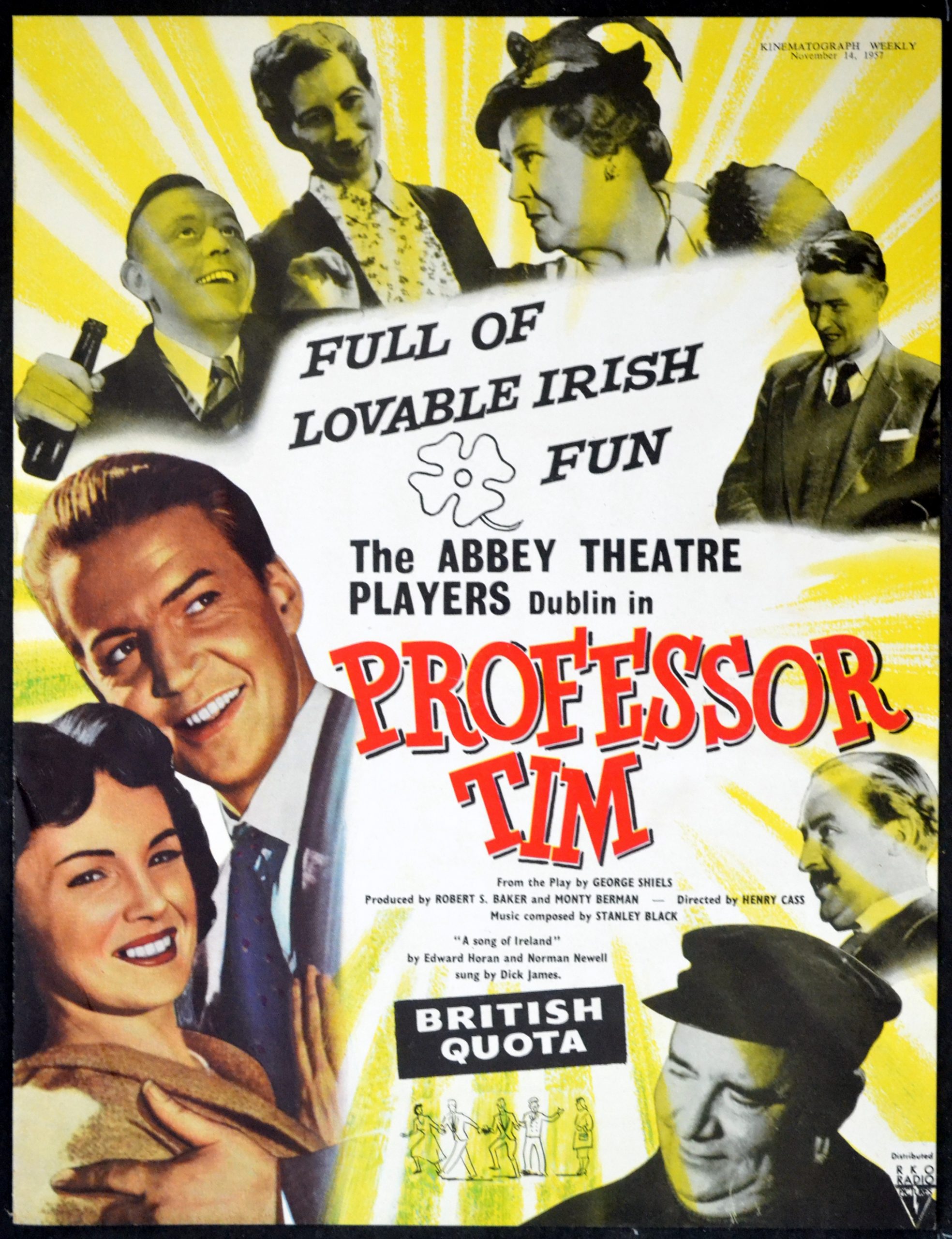 Original British 11 inch x 8 1/2 inch Trade Advertisement from Kinematograph Weekly for the 1957 Henry Cass Comedy PROFESSOR TIM, based on the play by George Shiels and starring Ray McAnally, Maire O’Donnell, Seamus Kavanagh and the Abbey Theatre Players Dublin.