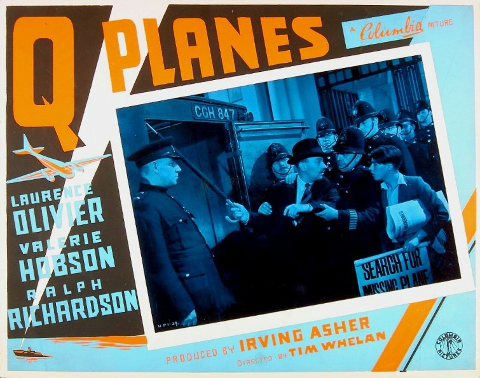 Original 11 inch x 14 inch U.S. Lobby Card for the 1939 Tim Whelan Thriller Q PLANES starring Ralph Richardson.