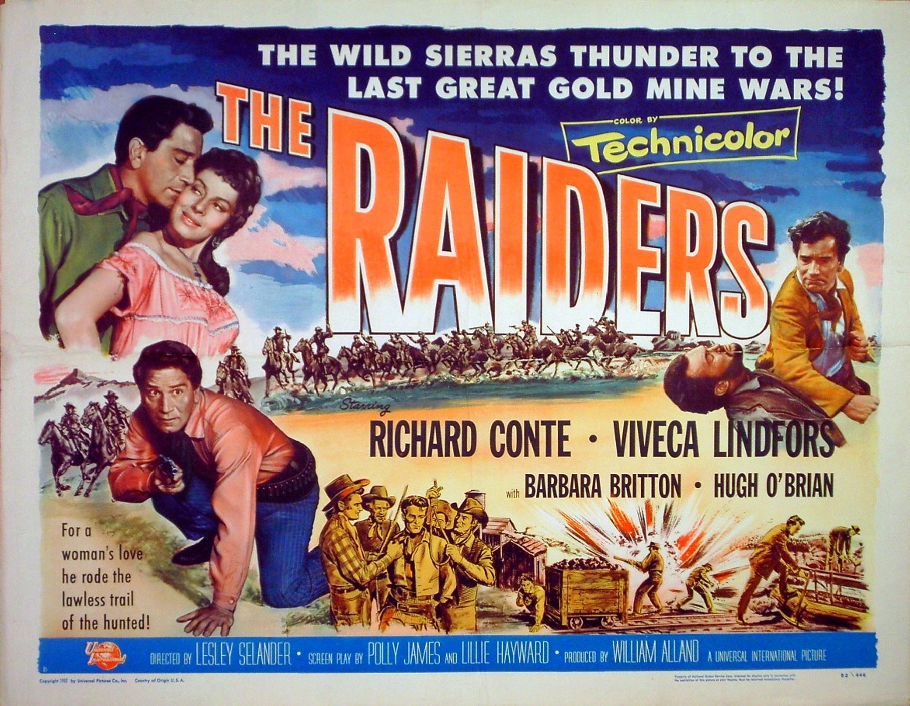 Original U.S. 22 inch x 28 inch Half Sheet Poster Style A for the 1952 Lesley Selander Western THE RAIDERS starring Richard Conte, Viveca Lindfors, Barbara Britton and Hugh O’Brian.