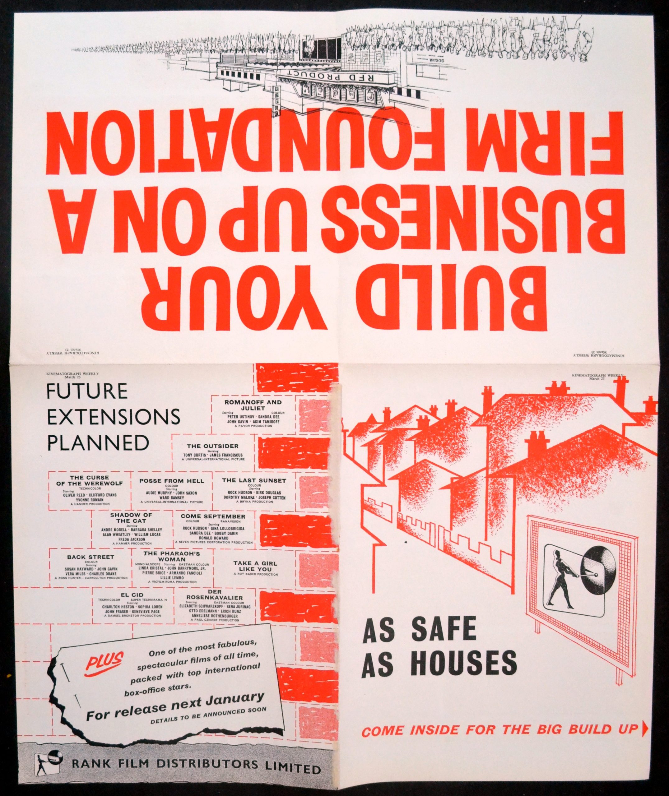 Original British 20 1/4 inch x 16 7/8 inch Fold-Out Trade Advertisement from Kinematograph Weekly for the 1961 film releases by Rank Film Distributors.