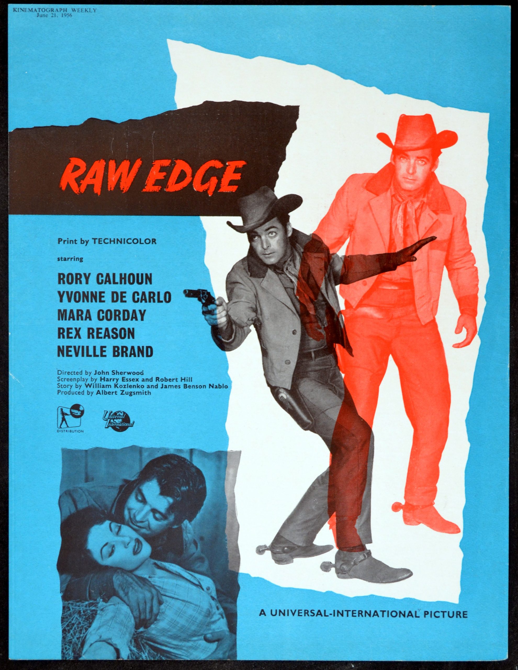 Original British 11 inch x 8 1/2 inch Trade Advertisement from Kinematograph Weekly for the 1956 John Sherwood Western RAW EDGE, based on the story by William Kozlenko and starring Rory Calhoun, Yvonne De Carlo, Mara Corday, Rex Reason, Neville Brand and Ed Fury.
