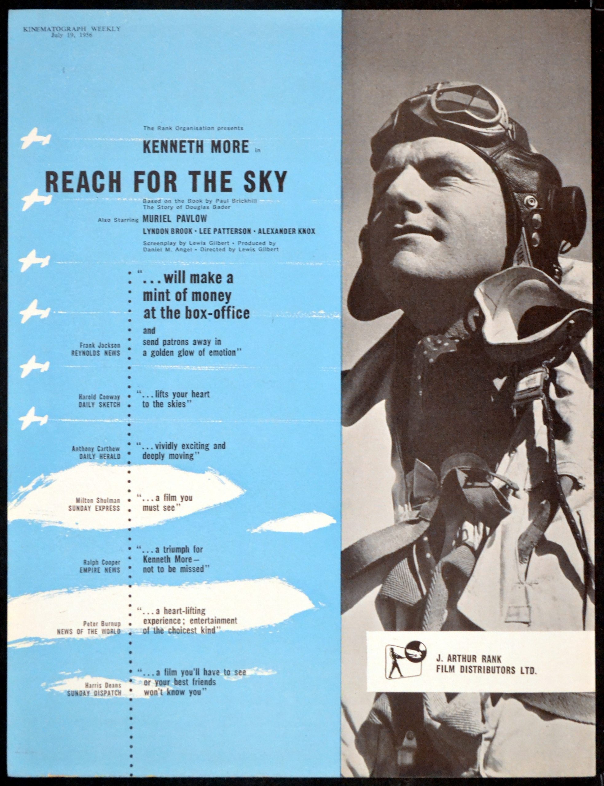 Original British 11 inch x 8 1/2 inch Trade Advertisement from Kinematograph Weekly for the 1956 Lewis Gilbert Biographical Drama REACH FOR THE SKY, based on the book “The Story of Douglas Bader” by Paul Brickhill and starring Kenneth More, Muriel Pavlow, Lyndon Brook, Lee Patterson, Alexander Knox, Dorothy Alison, Sydney Tafler, Howard Marion-Crawford, Jack Watling, Nigel Green, Ronald Adam and Eddie Byrne.