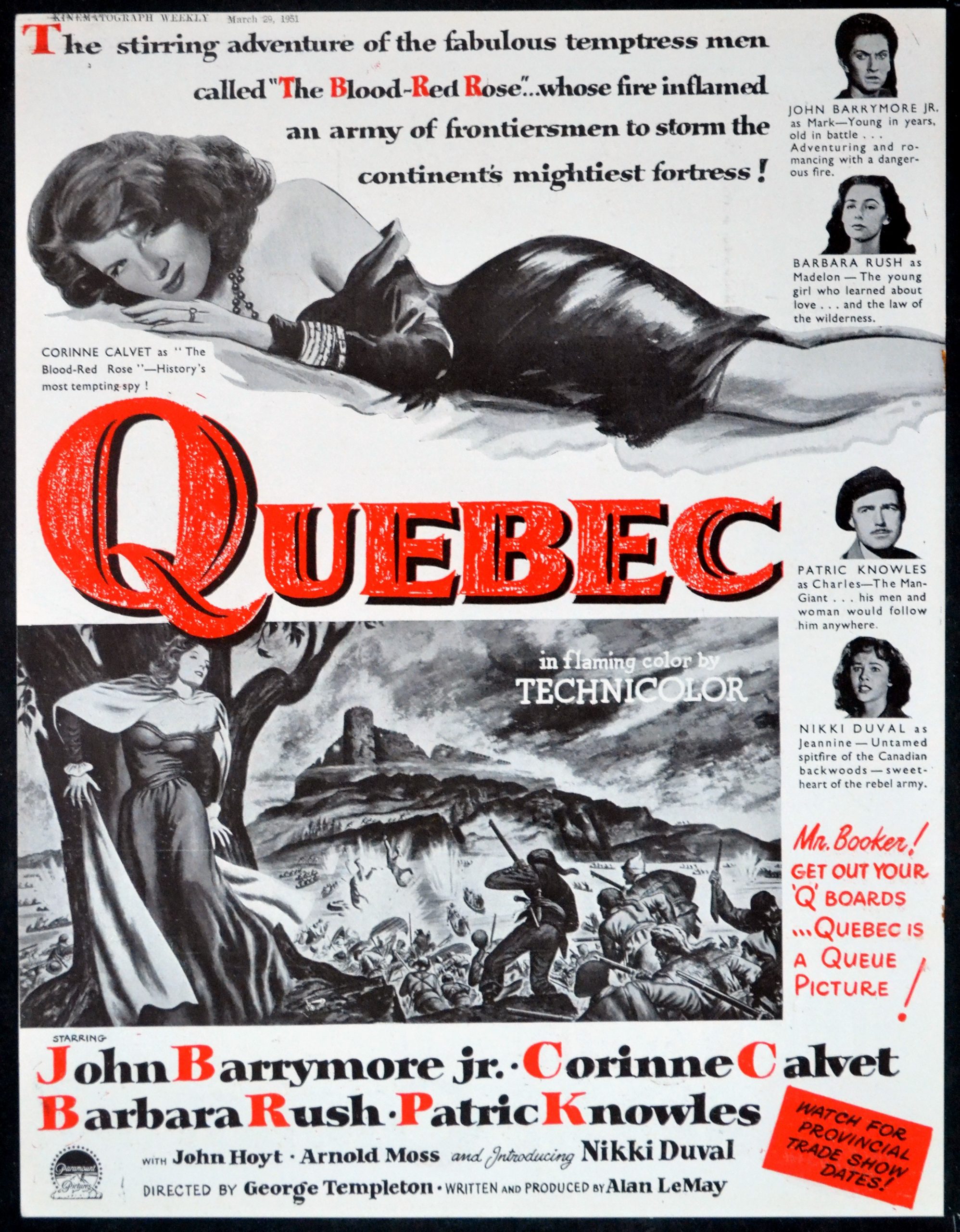 On the reverse is the 1951 George Templeton Adventure QUEBEC starring John Drew Barrymore, Corinne Calvet, Barbara Rush and Patric Knowles.