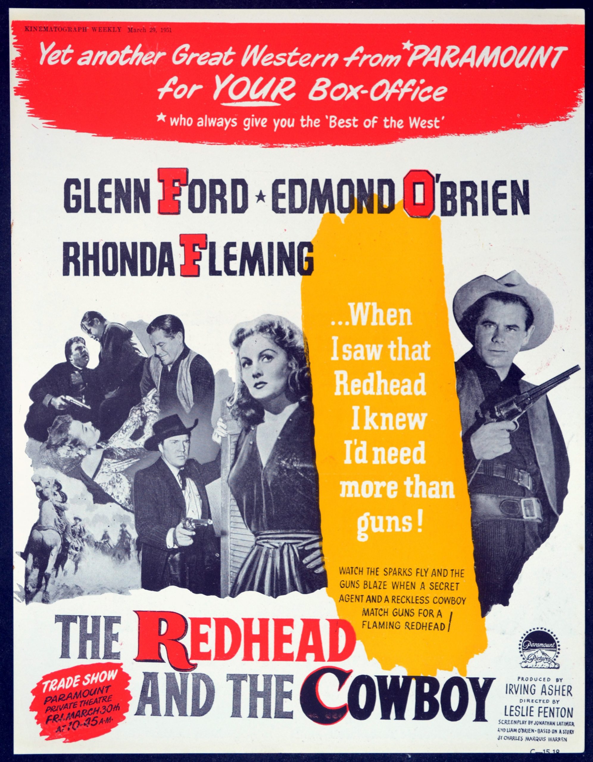 Original British 11 inch x 8 1/2 inch Double-Sided Trade Advertisement from Kinematograph Weekly for the 1951 Leslie Fenton Western THE REDHEAD AND THE COWBOY, based on a story by Charles Marquis Warren and starring Glenn Ford, Edmond O’Brien, Rhonda Fleming and Alan Reed.