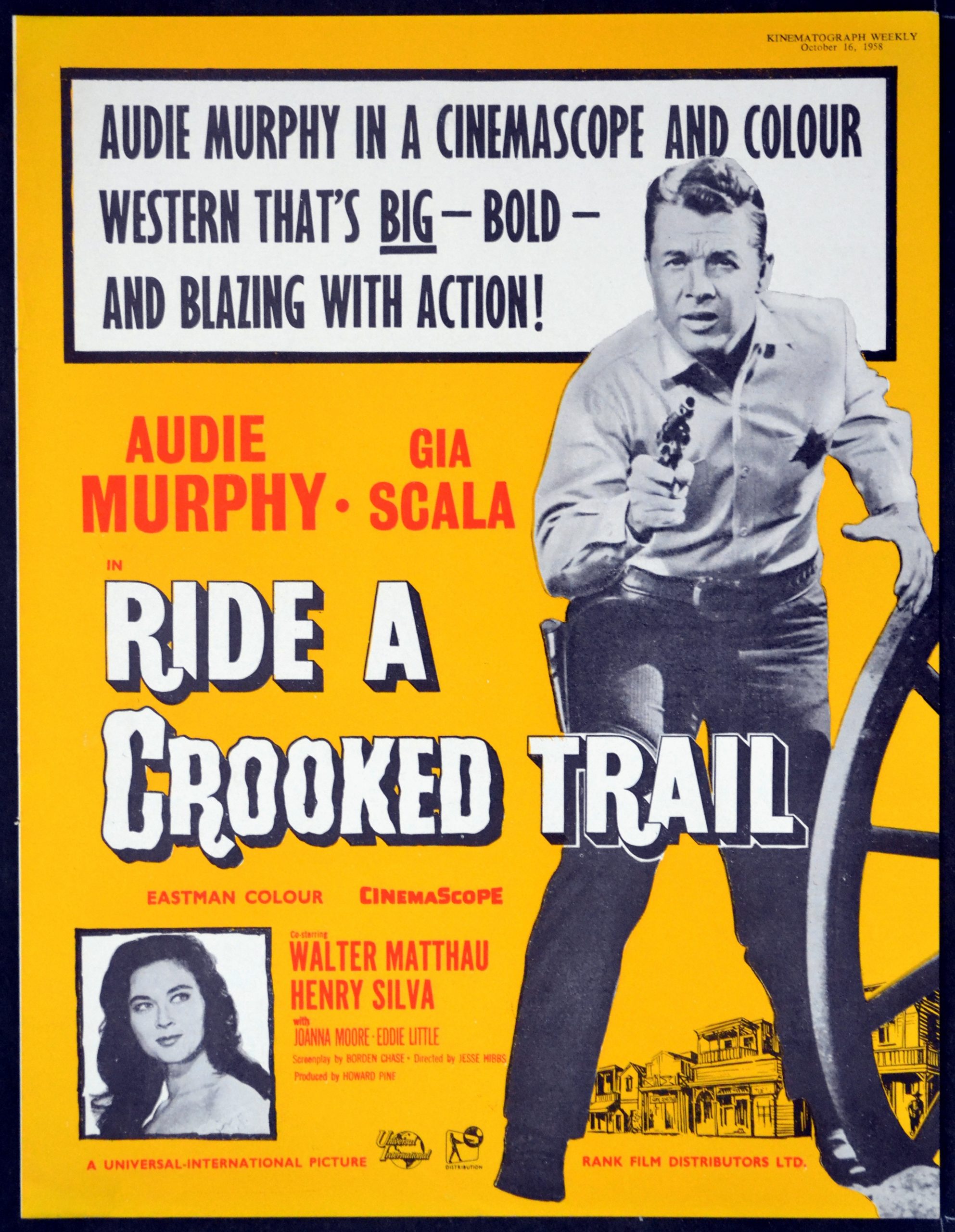 Original British 11 inch x 8 1/2 inch Trade Advertisement from Kinematograph Weekly for the 1958 Jesse Hibbs Western RIDE A CROOKED TRAIL starring Audie Murphy, Gia Scala, Walter Matthau and Henry Silva.