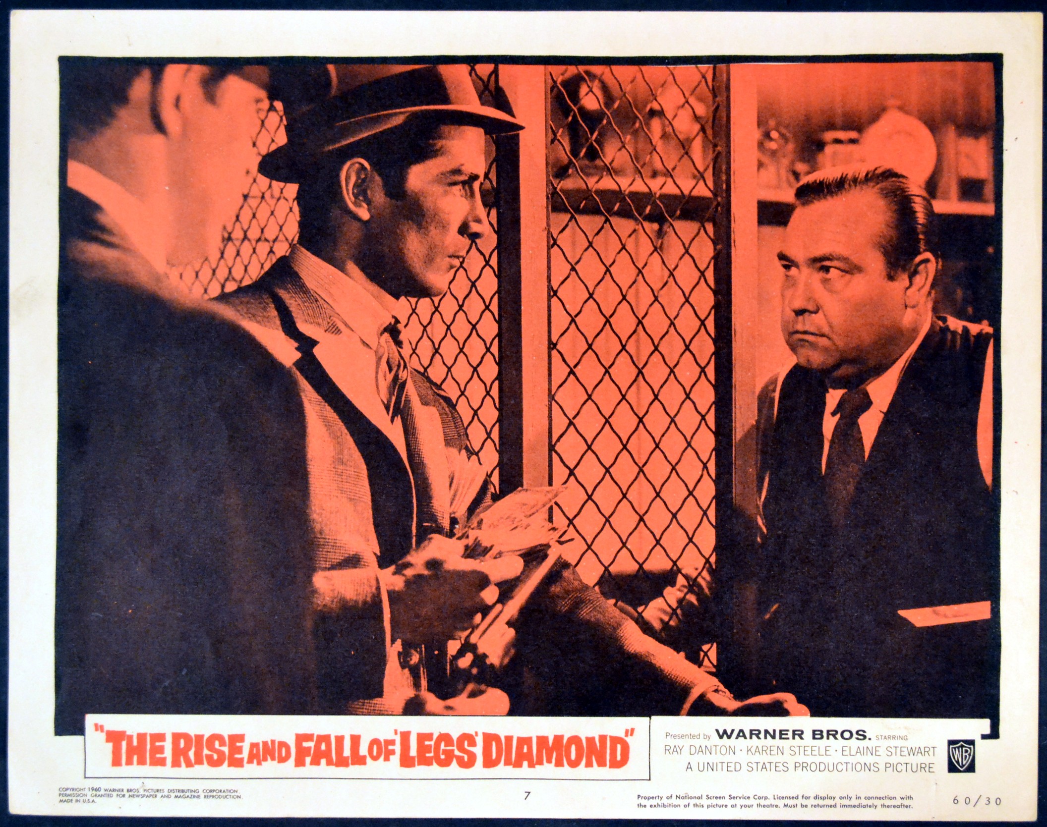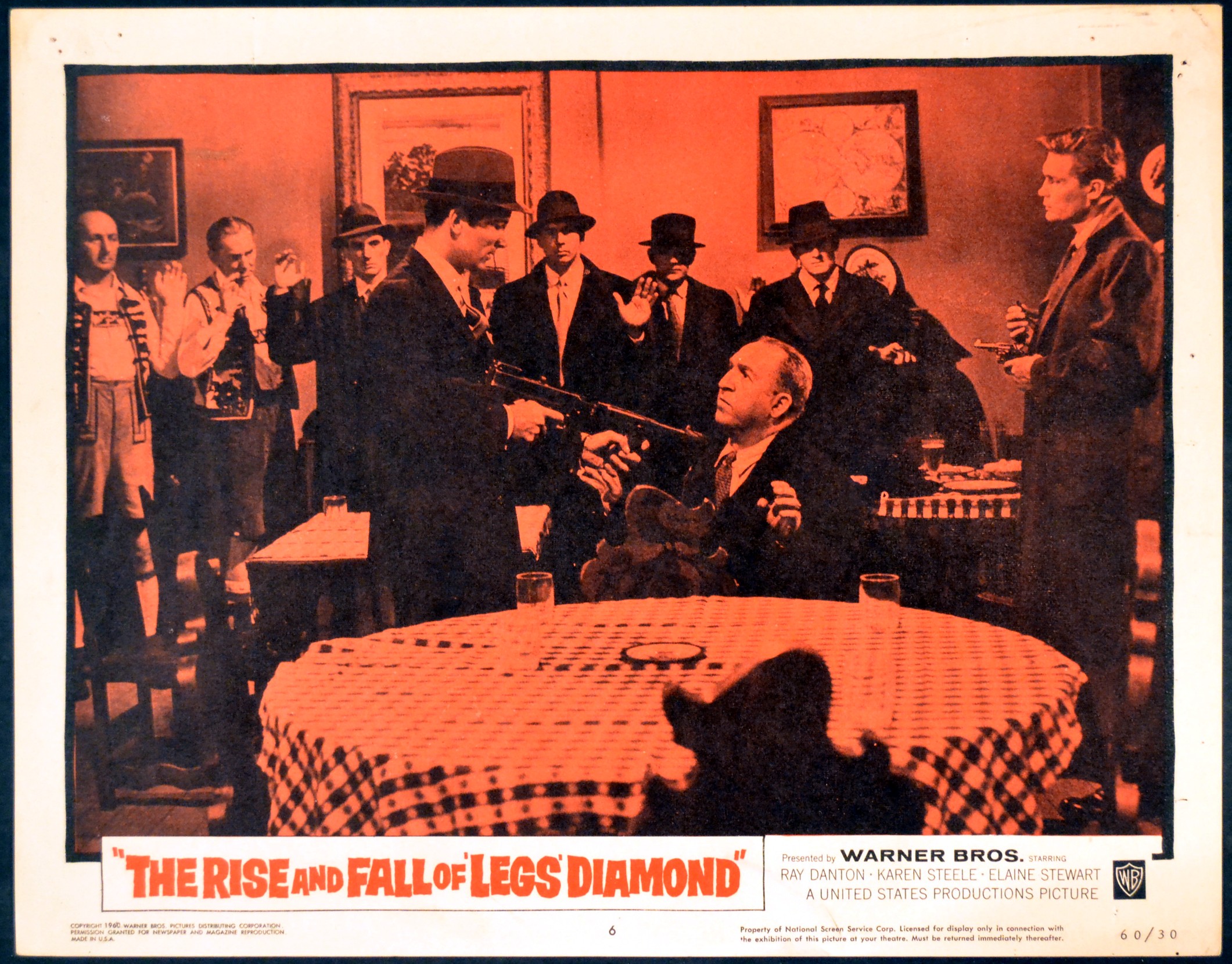 2 Original 11 inch x 14 inch U.S. Lobby Cards for the 1960 Budd Boetticher Gangster Movie THE RISE AND FALL OF LEGS DIAMOND starring Ray Danton as Jack ‘Legs’ Diamond, Karen Steele, Elaine Stewart, Warren Oates, Jess White, Simon Oakland, Robert Lowery, Dyan Cannon and Richard Gardner as Vincent ‘Mad Dog’ Coll.