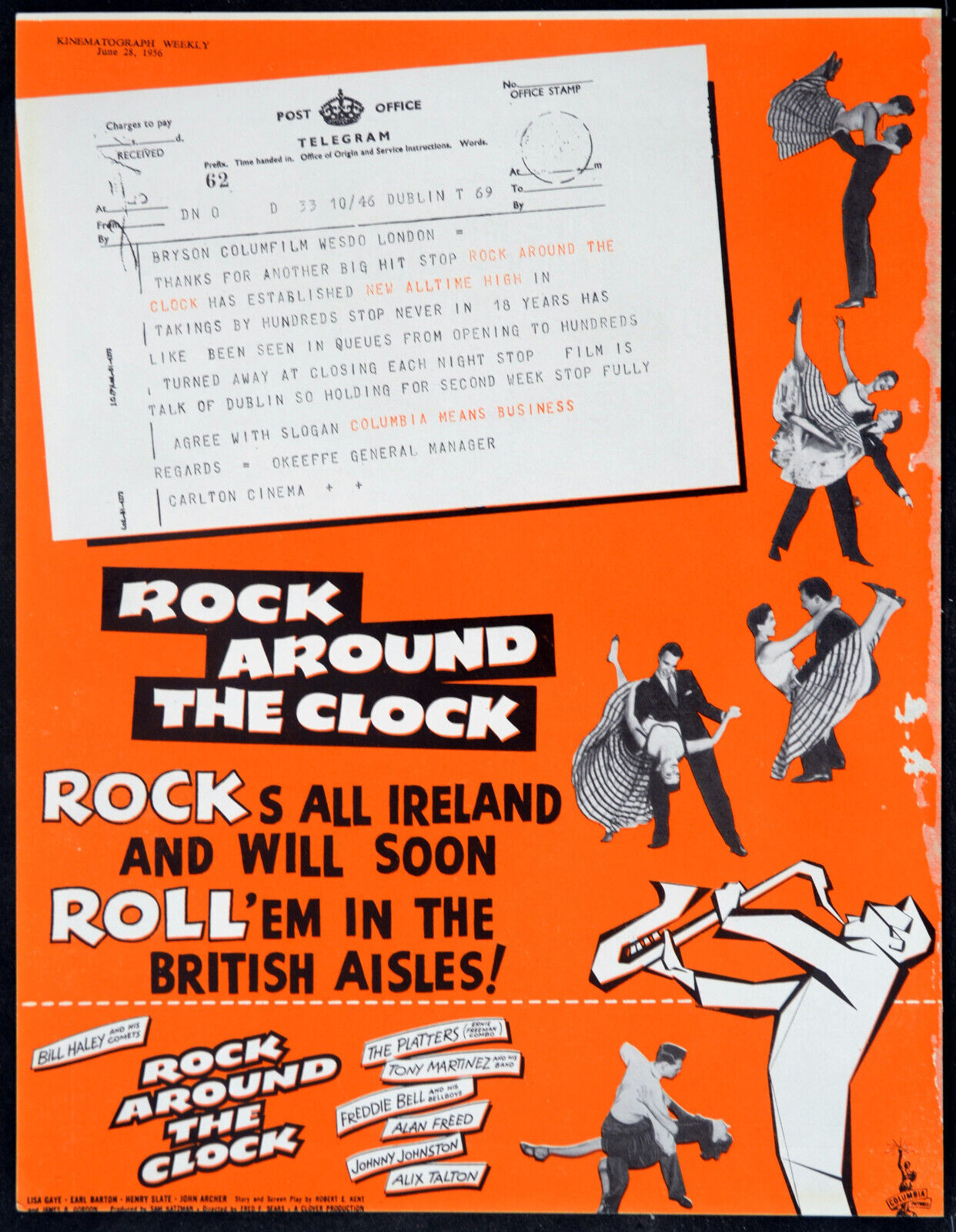 Original British 11 inch x 8 1/2 inch Trade Advertisement from Kinematograph Weekly for the 1956 Fred F. Sears Musical ROCK AROUND THE CLOCK starring Bill Haley and the Comets, The Platters, Tony Martinez and His Band, Freddie Bell and His Bellboys, Alan Freed, Johnny Johnston and Alix Talton.
