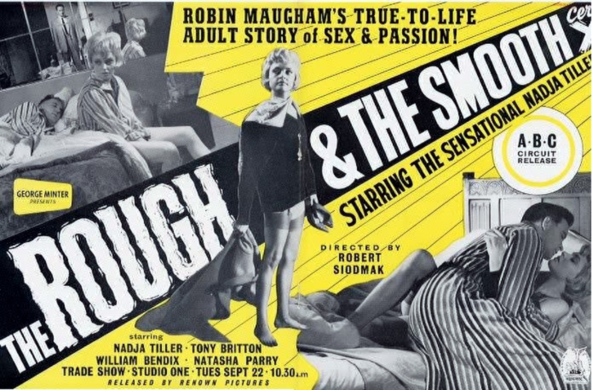 Original British 17 inch x 11 inch Trade Advertisement for the 1959 Robert Siodmak Drama THE ROUGH AND THE SMOOTH, based on the novel by Robin Maugham and starring Nadja Tiller, Tony Britton, William Bendix, Natasha Parry, Norman Wooland, Donald Wolfit, Tony Wright, Adrienne Corri, Joyce Carey, Edward Chapman and Beatrice Varley.