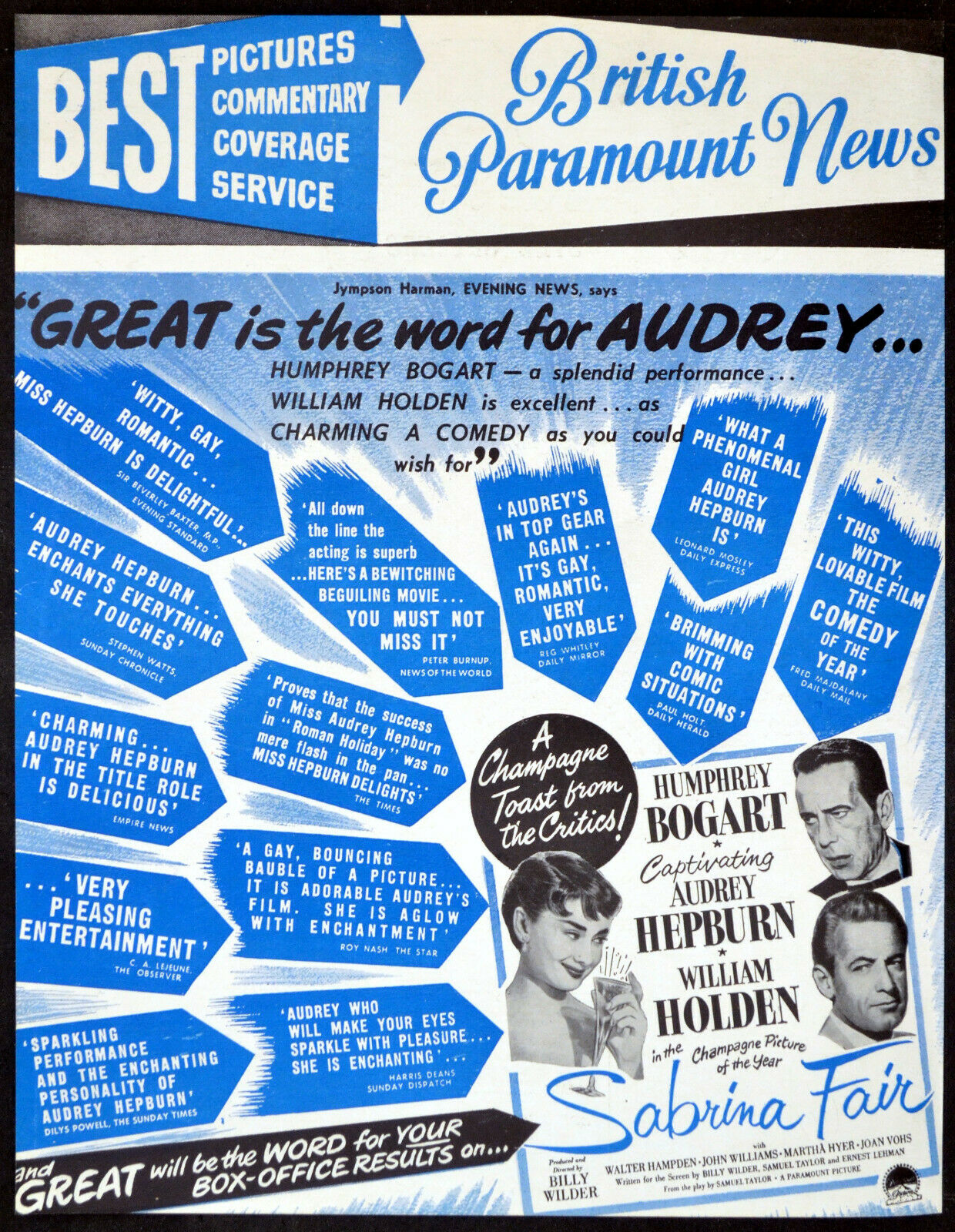 Original British 10 3/4 inch x 8 3/8 inch Trade Advertisement from Kinematograph Weekly September 23 for the 1954 Billy Wilder Romantic Comedy SABRINA FAIR starring Humphrey Bogart, Audrey Hepburn, William Holden, Walter Hampden, John Williams, Martha Hyer, Joan Vohs, Marcel Dalio and and Ellen Corby.