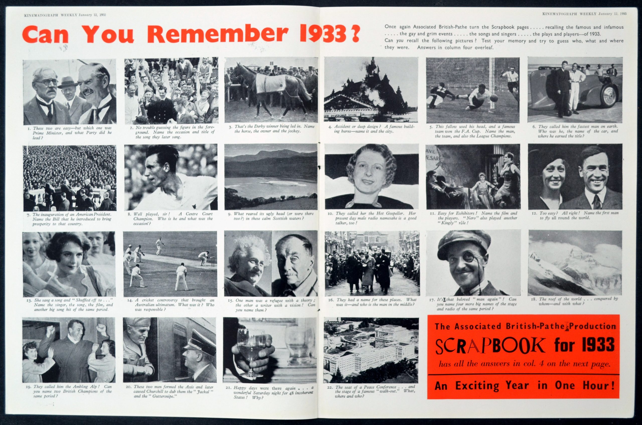 Original British 11 inch x 17 inch Trade Advertisement Kinematograph Weekly for 1950 The Associated British-Pathe Documentary SCRAPBOOK FOR 1933 directed by Peter Baylis with the voices of Robert Ayres, Michael Balfour, Edric Connor, Maurice Denham, Joyce Grenfell, Hugh Griffith, James Hayter, Howard Marion-Crawford, Stephen Murray and Wilson Keppel and Betty .