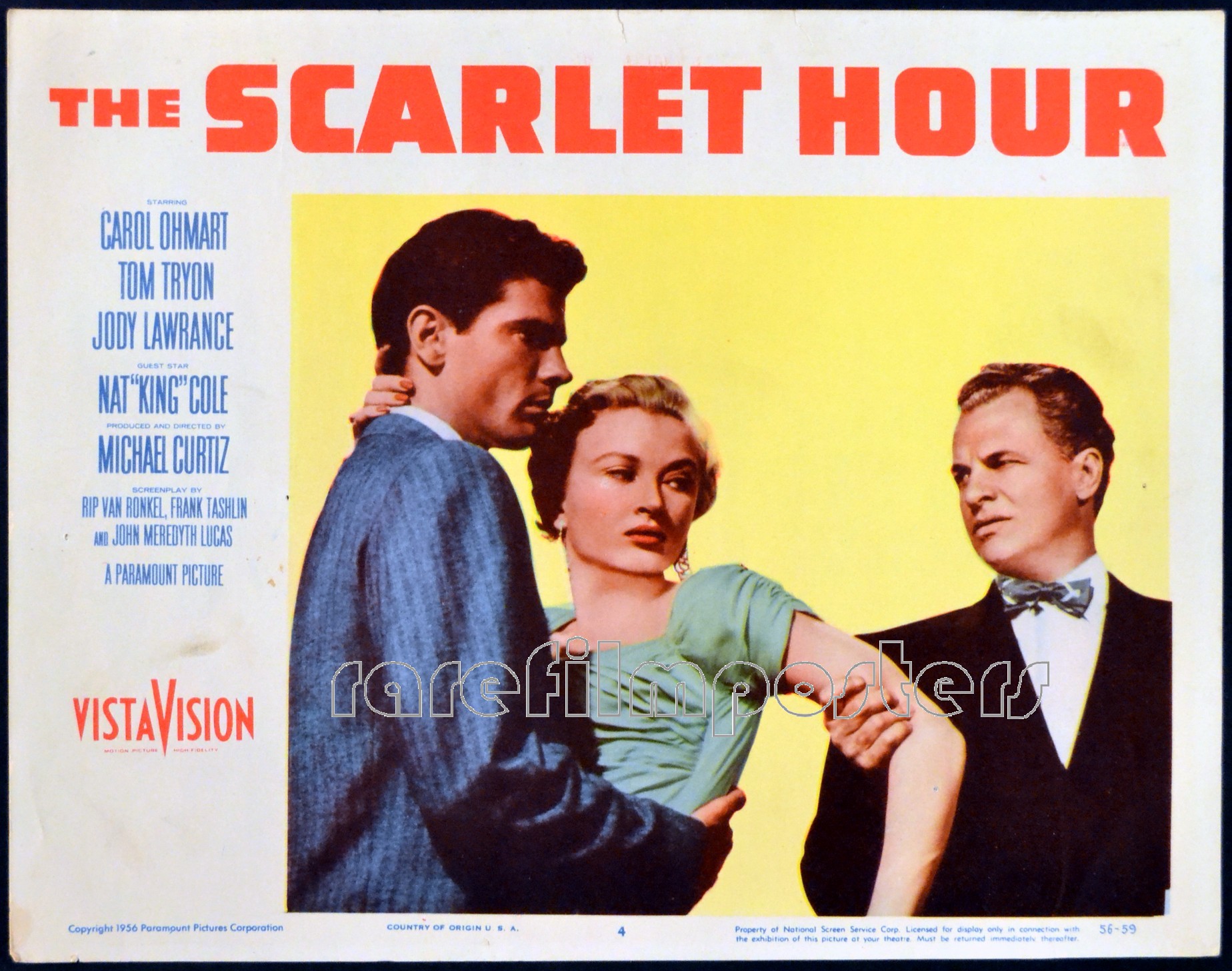 Original U.S. 11 inch x 14 inch Lobby Card of TOM TRYON, CAROL OHMART & JAMES GREGORY in the 1956 Michael Curtiz Film Noir THE SCARLET HOUR, based on the story “The Kiss Off” by Frank Tashlin