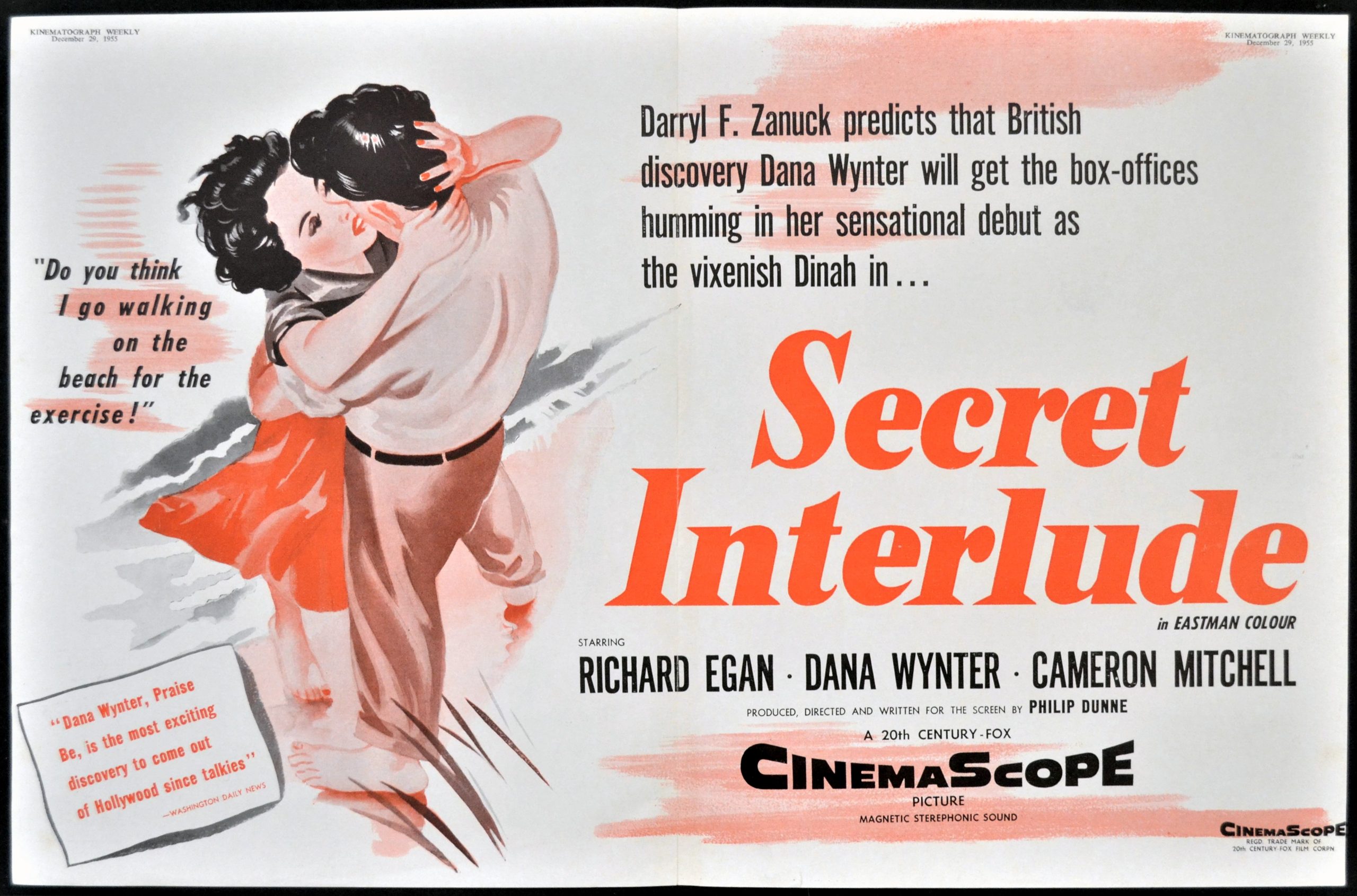 Original British 11 inch x 17 inch Trade Advertisement for the 1955 Philip Dunne Romantic Drama SECRET INTERLUDE (THE VIEW FROM POMPEY’S HEAD), based on the novel by Hamilton Basso and starring Richard Egan, Dana Wynter, Cameron Mitchell, Sidney Blackmer, Majorie Rambeau, Dorothy Patrick, Rosemarie Bowe, Jerry Paris, Ruby Goodwin and DeForest Kelley.